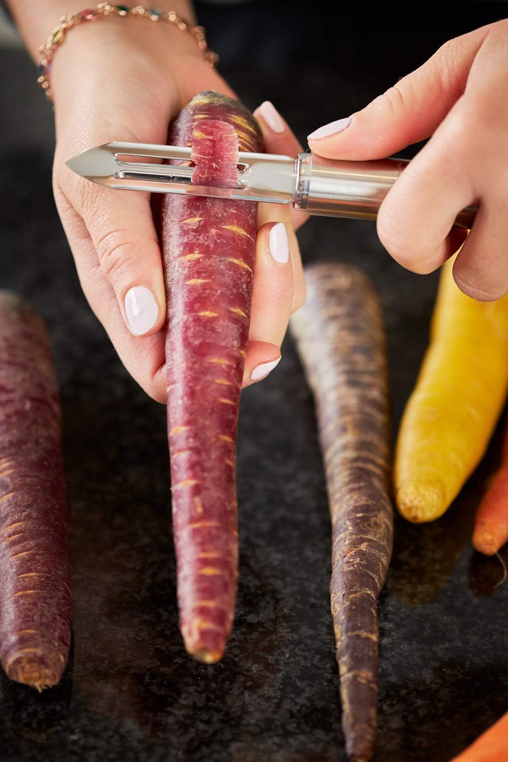 - VERSATILE: Handy universal peeler for gently peeling of fruits and vegetables - ideal for long, slim vegetables such as carrots, zucchinis or cucumbers - comfortable thanks to its seamless construction. This peeler is suitable for both right-handed and left-handed users - for working away from the body and towards the body.