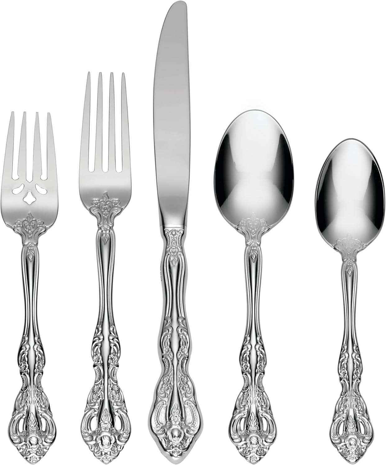 - 5-piece flatware set with service for 1. Set includes 1 each: salad/dessert fork, place fork, place knife, place spoon, and teaspoon