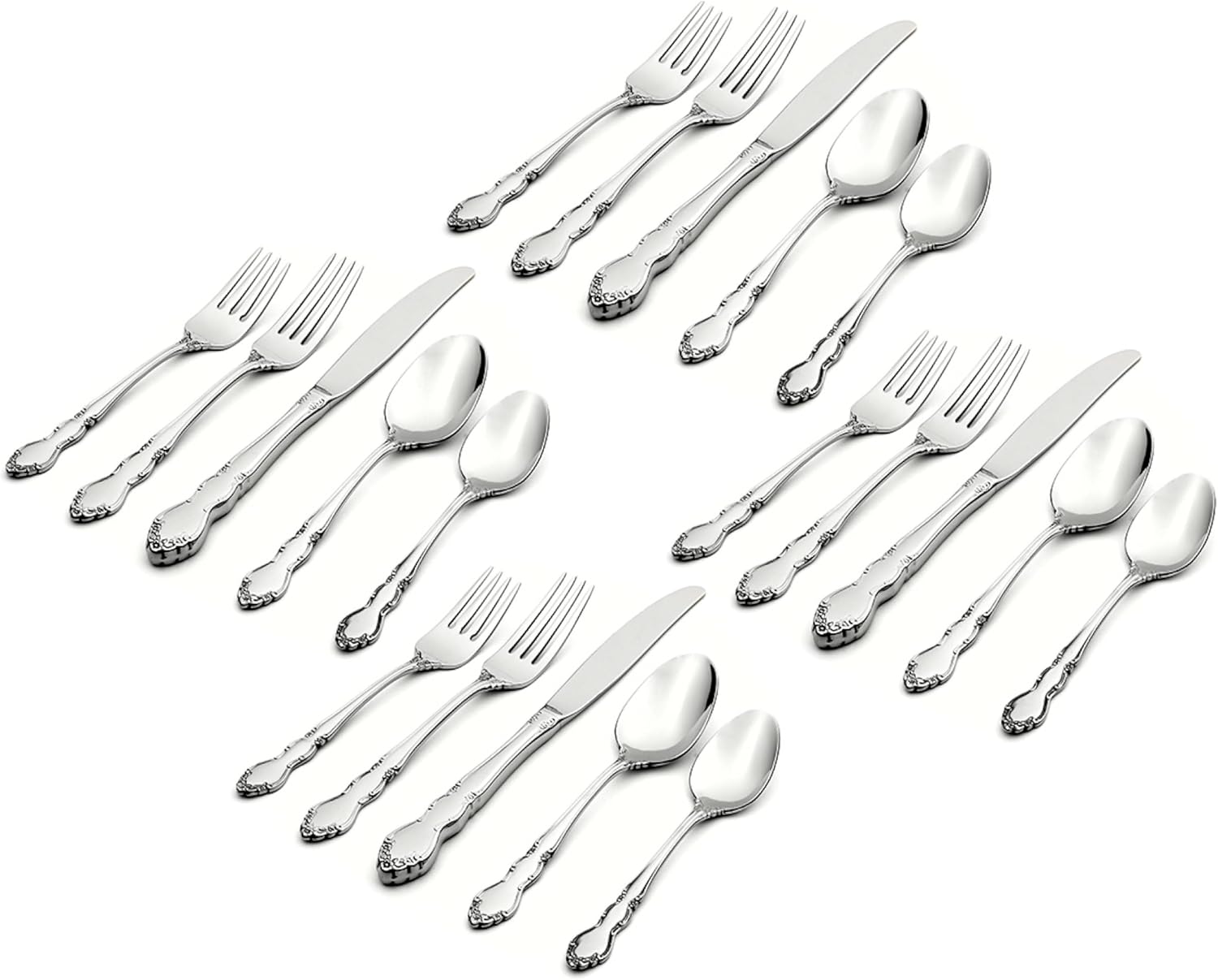 - Included Components : (4) 5 Piece Place Settings, (4) Dinner knives, (4) Dinner forks, (4) Salad forks, (4) Dinner spoons, (4) Teaspoons (4) 5 Piece Place Settings, (4) Dinner knives, (4) Dinner forks, (4) Salad forks, (4) Dinner spoons, (4) Teaspoons
