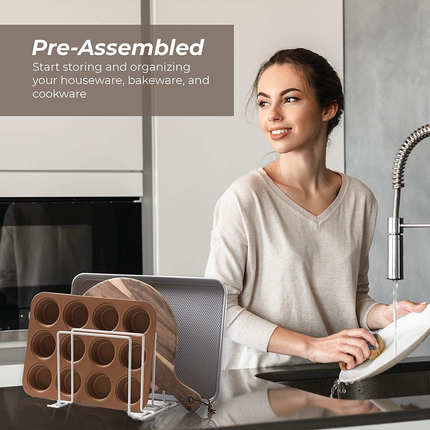 - Multipurpose: Our bakeware rack is perfect for organizing a baking/cookie sheet, big dish or plate, tray, pans, tins, and cutting boards. Its also rust resistant, so it cab also be a cooling/drying rack. No assembly or tools are required!