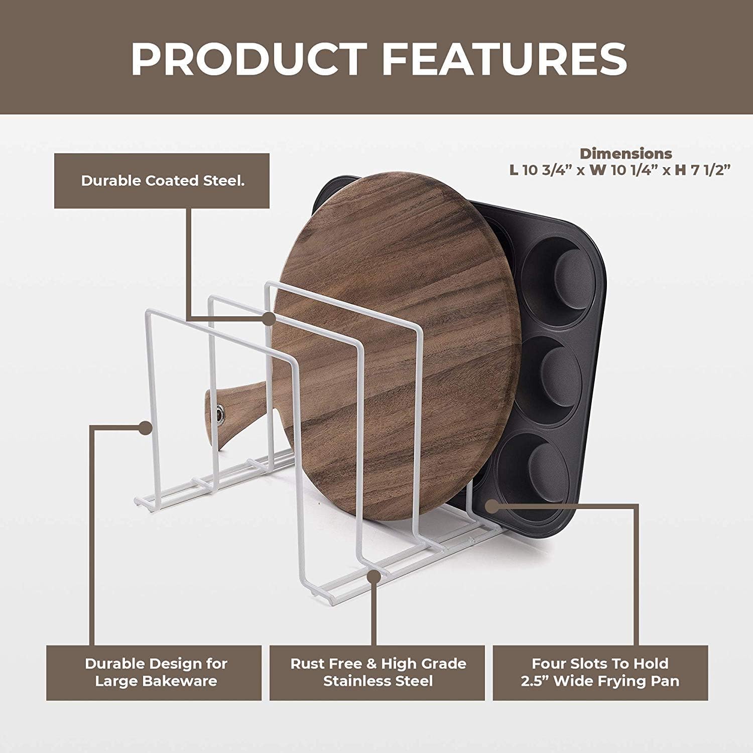 - Anti Slip: Made of premium quality steel, our lid organizer organizer supports the weight of your pan or pot cover without tipping or falling over. We have also included attachable anti slip grips to help ensure it remains in place.