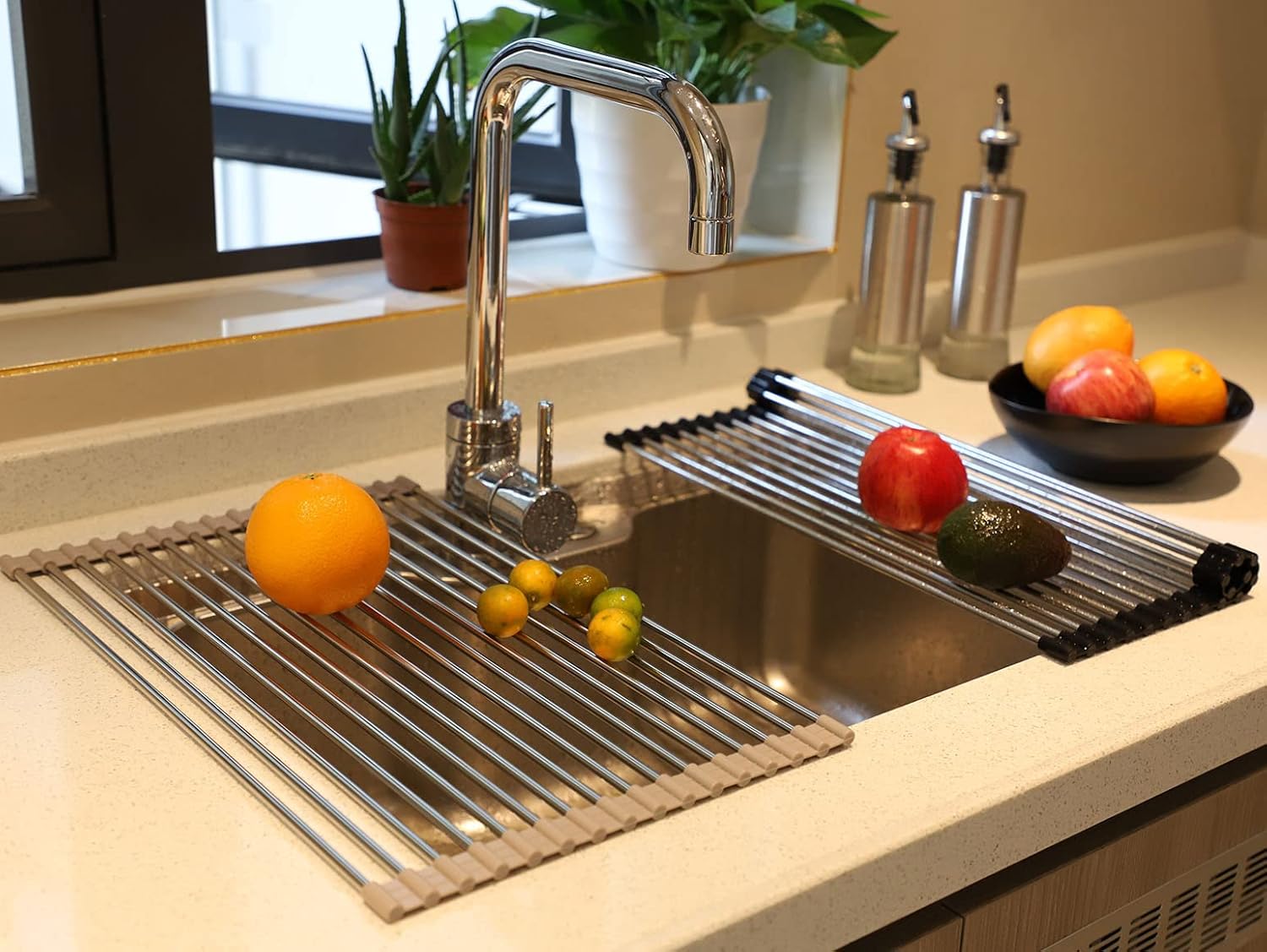 - Roll up Sink Drying Rack and Spacing-saving Dish Drying Mat: This dish drainer can roll up and go in a drawer quickly when not in use. Works great and keeps the kitchen sink area looking neat, the best one of dish drainers for kitchen counter. You can roll up this over the sink dish drying rack as much as you like during using it and for the pipes also can be removable