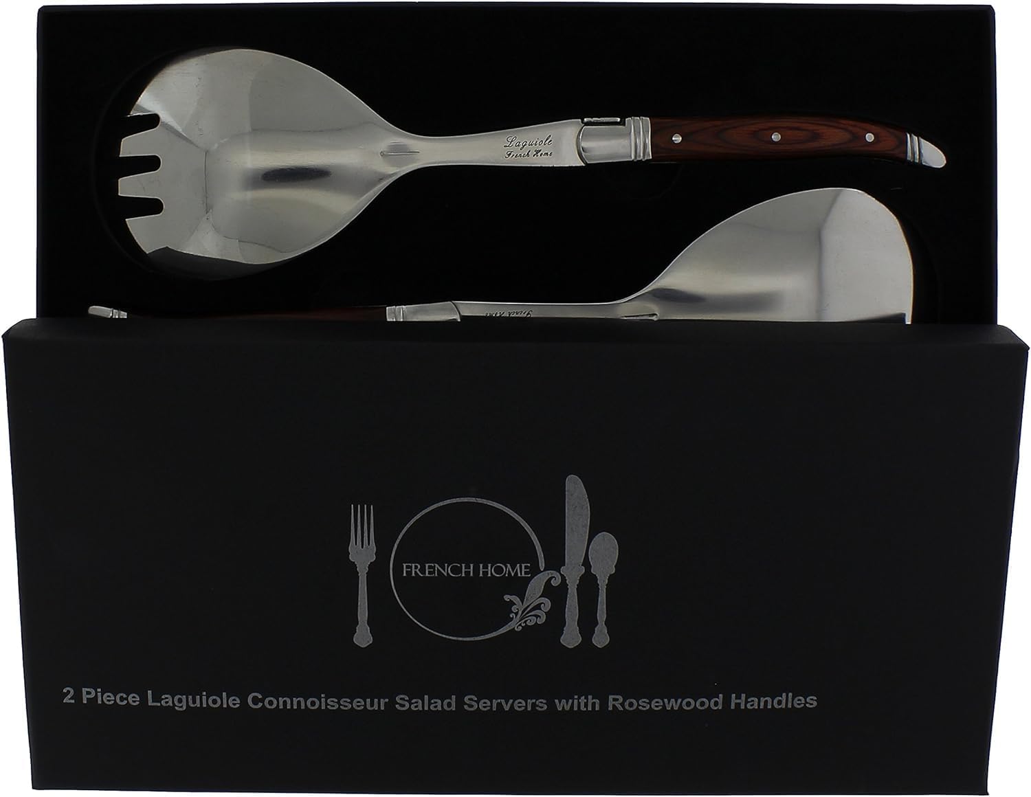 - Attractive Design: Serve your salads with style and flair with this pair of 10.5” L x 3"W stainless-steel salad spoon and salad forks with rosewood handles. French Home's traditional and elegant Laguiole Salad serving utensils set has a comfortable to hold three rivet curved handle with the iconic French bee emblem on its bolster.