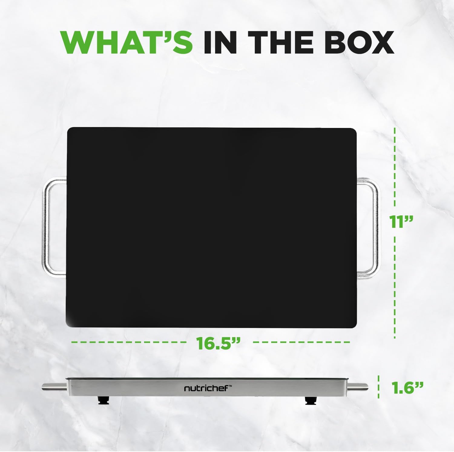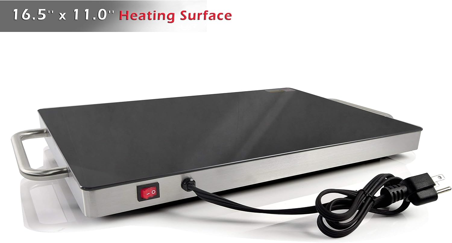 - TABLETOP SAFE: The hot food warmer features stainless steel construction and non-stick, heat-resistant tempered glass. The high-powered heating element heats quickly and the ultra-thin space saving design is safe for placement on any table or counter