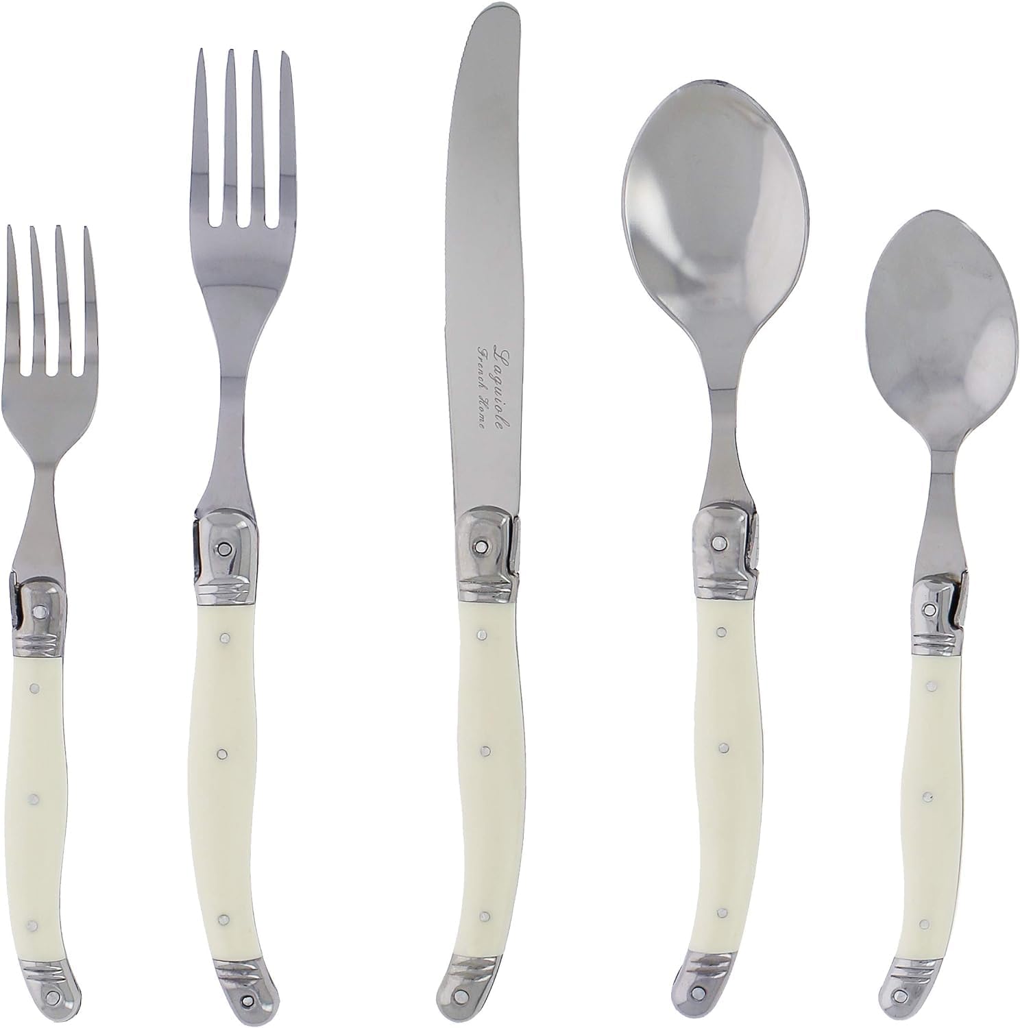 - Stylish and Functional: With its chic ivory-colored handles, the Laguiole flatware set for 4 adds sophistication to any table; practical and refined, this dishwasher safe Laguiole knife, fork and spoon set is comfortable to hold and easy to use
