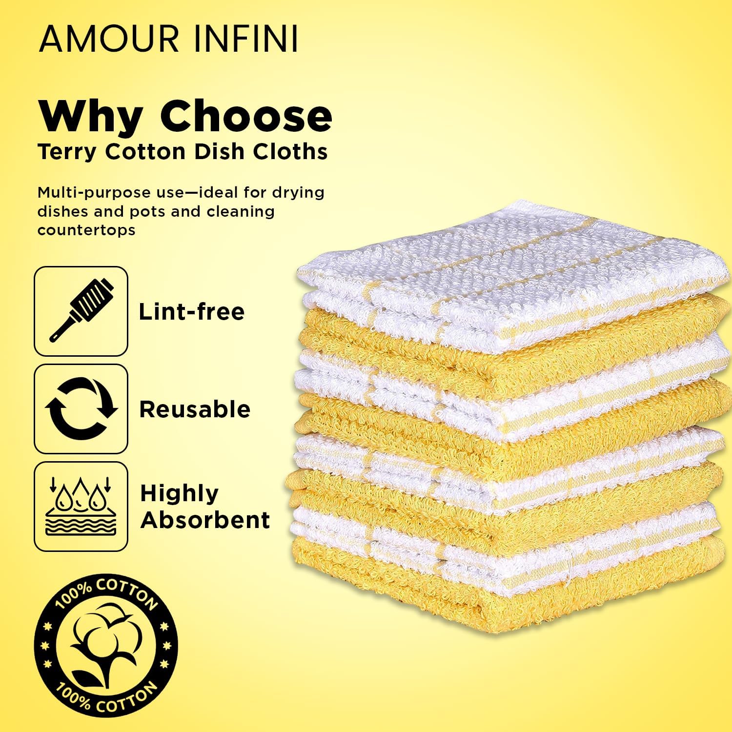 AMOUR INFINI Cotton Kitchen Dish Cloths Set of 8 – Highly Absorbent, Super Soft Premium Terry Cleaning Cloth (12"x12" Inch) Premium Dishcloths for Washing Dishes (Yellow)