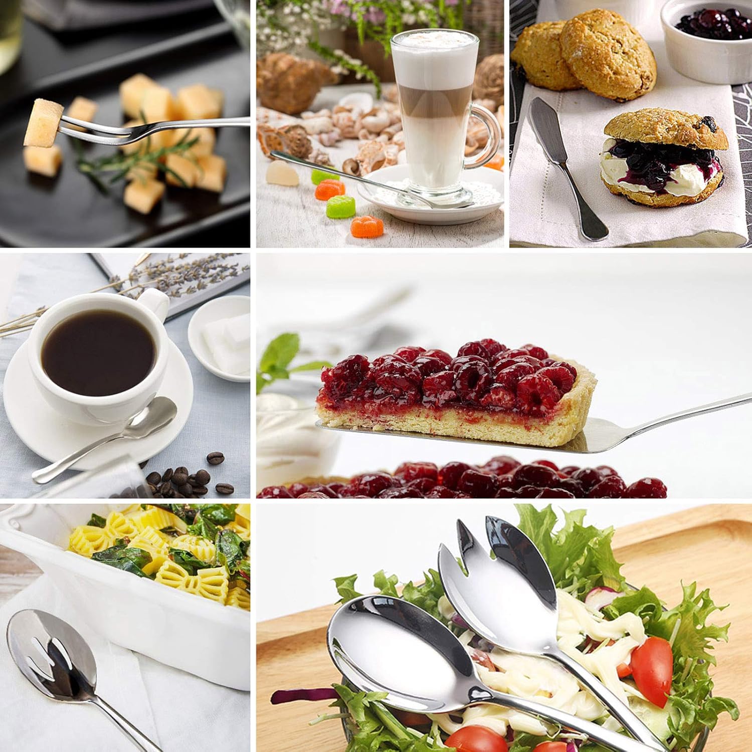 - Included Components : '9 inches dinner knives' x 8, '8 inches dinner forks' x 8, '8 inches dinner spoons' x 8, '6.7 inches salad forks' x 8, '6.7 inches teaspoons' x 8, '8.8 inches slotted serving spoon' x 1, '8.8 inches serving spoon' x 1, '8.8 inches pie server' x 1, '8 inches salad spork' x 1, '7.7 inches long handle spoon' x 1, '6 inches butter knife' x 1, '5.8 inches fruit fork' x 1, '5 inches sugar spoon' x 1" '9 inches dinner knives' x 8, '8 inches dinner forks' x 8, '8 inches dinner spoons' x 8, '6.7 inches salad forks' x 8, '6.7 inches teaspoons' x 8, '8.8 inches slotted serving spoon' x 1β¦ See more