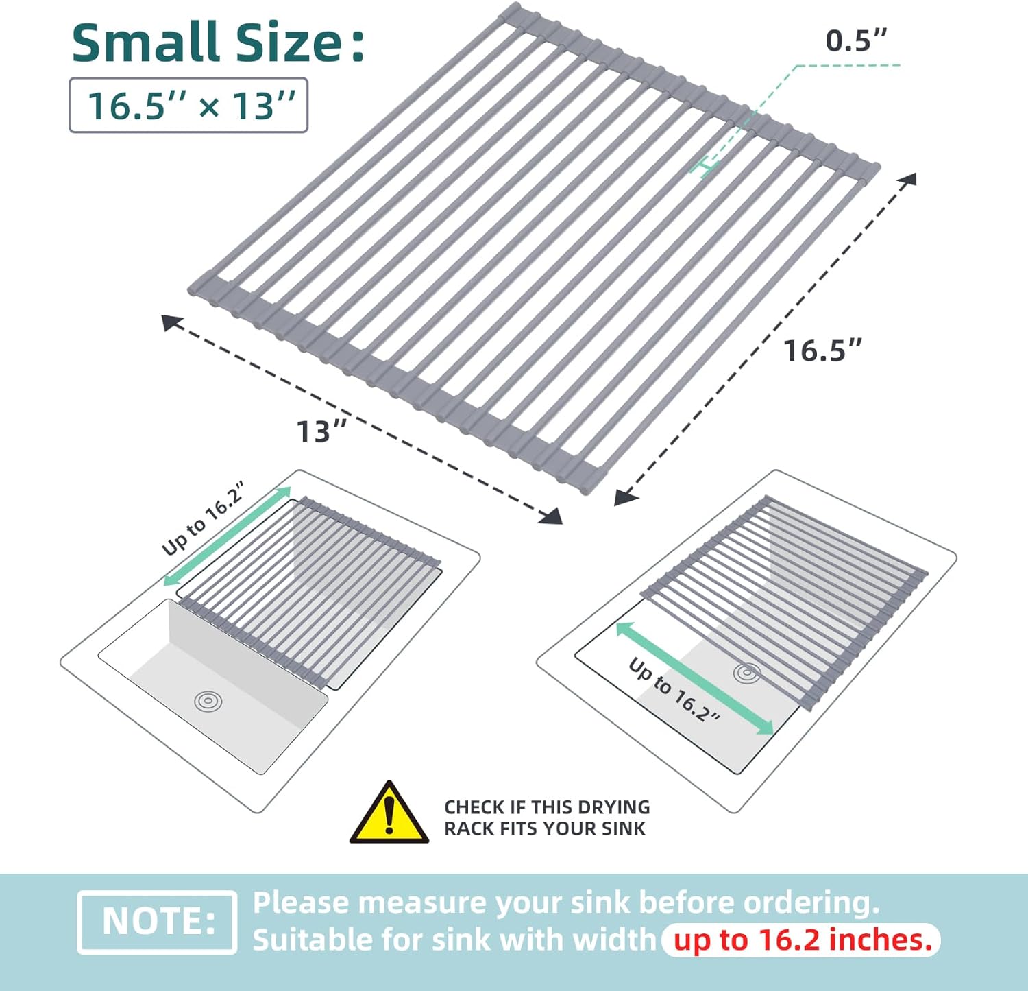 - FITS SINKS OF SMALL SIZES: This 16.5x13 in roll up dish drying rack is designed to fit small sinks with the shorter side does NOT exceed 16.2''. [NOTE- Please measure your sink before ordering. If your sink is wider than 16.2" please order a larger model]. NOT for farm's sink with one side not level