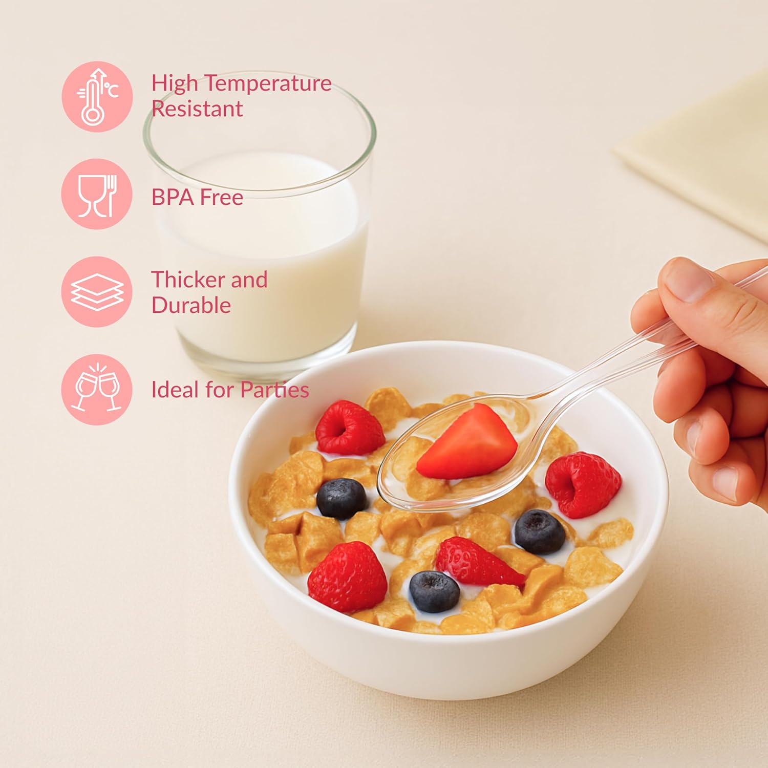 - Heavy Duty Plastic Spoons for Parties: These strong disposable plastic spoons are built to handle hot soups, cold desserts, and hearty dishes without bending, cracking, or snapping during any event