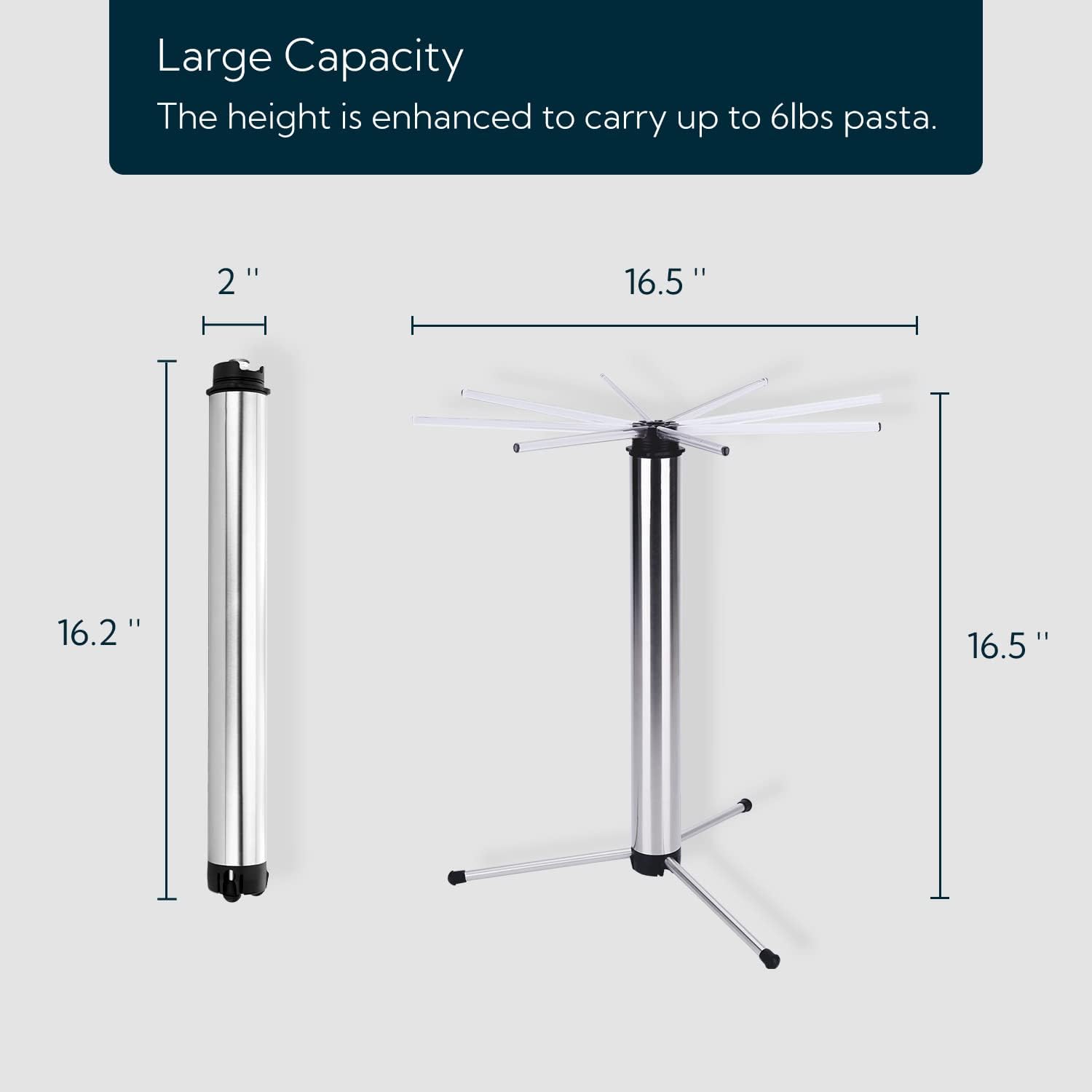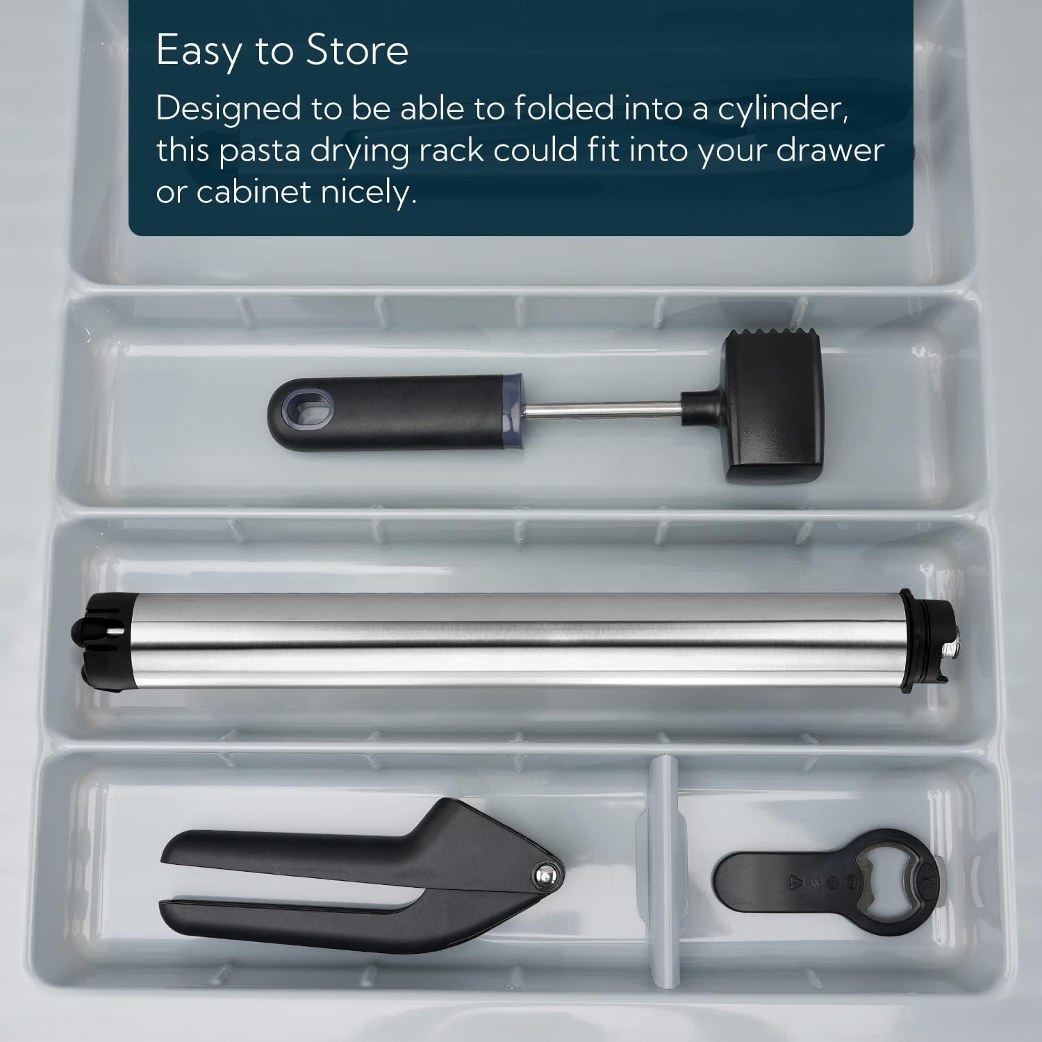 - The Most Compact Pasta Dryer Rack on The Market: Compact enought to store in your drawer. Including pasta drying rack and pasta transfer wand. Equipped with 8 sturdy rods to carry up 6 lb (3 kg) of pasta
