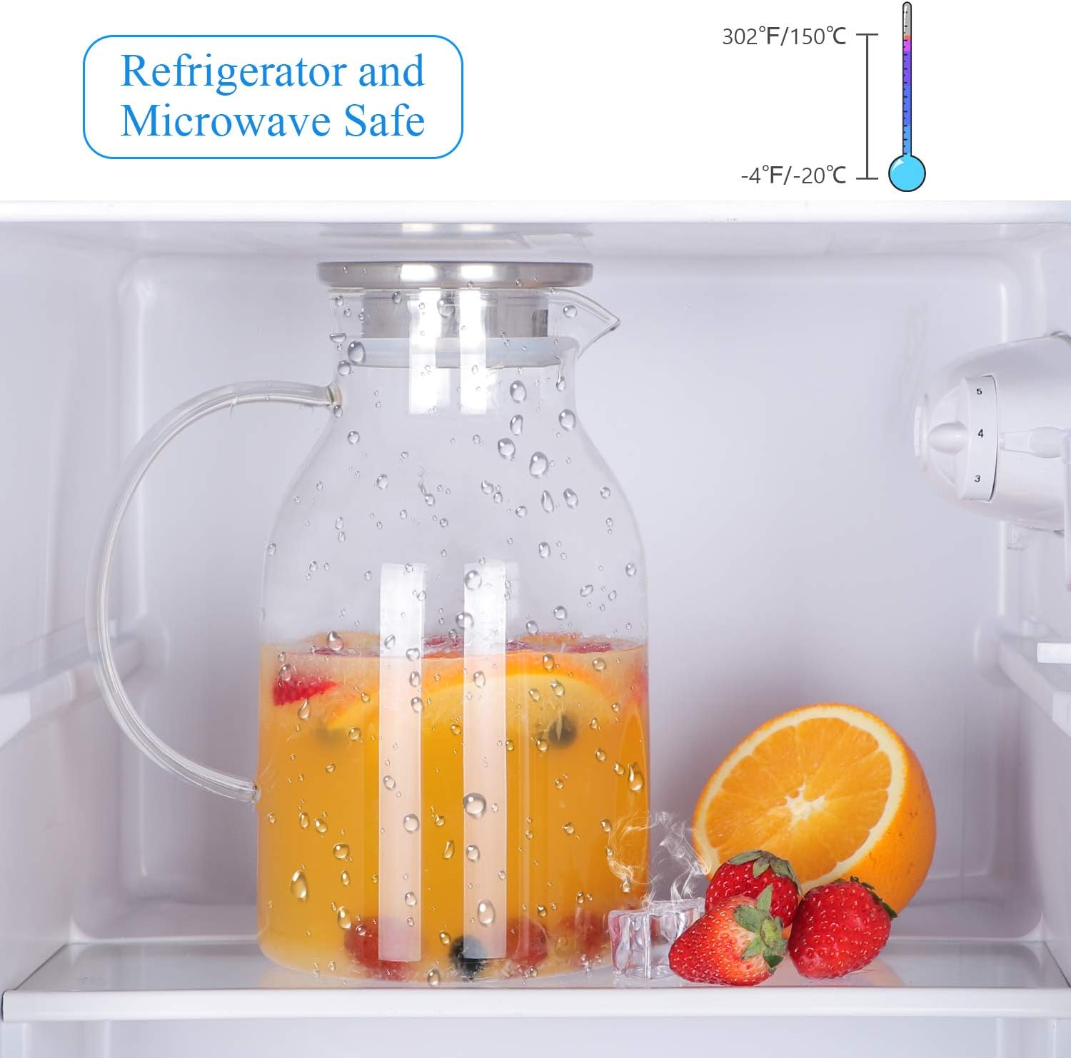 - Temperature safe for cold or hot: this glass water pitcher withstands temperature is -4β to 302β. Itβs stovetop safe and well-known for its low coefficients and high thermal resistance, thus safe for gas or electric stove use. Can not be used on induction cooktop. You can pour boiling water or ice water into this pitcher safely.