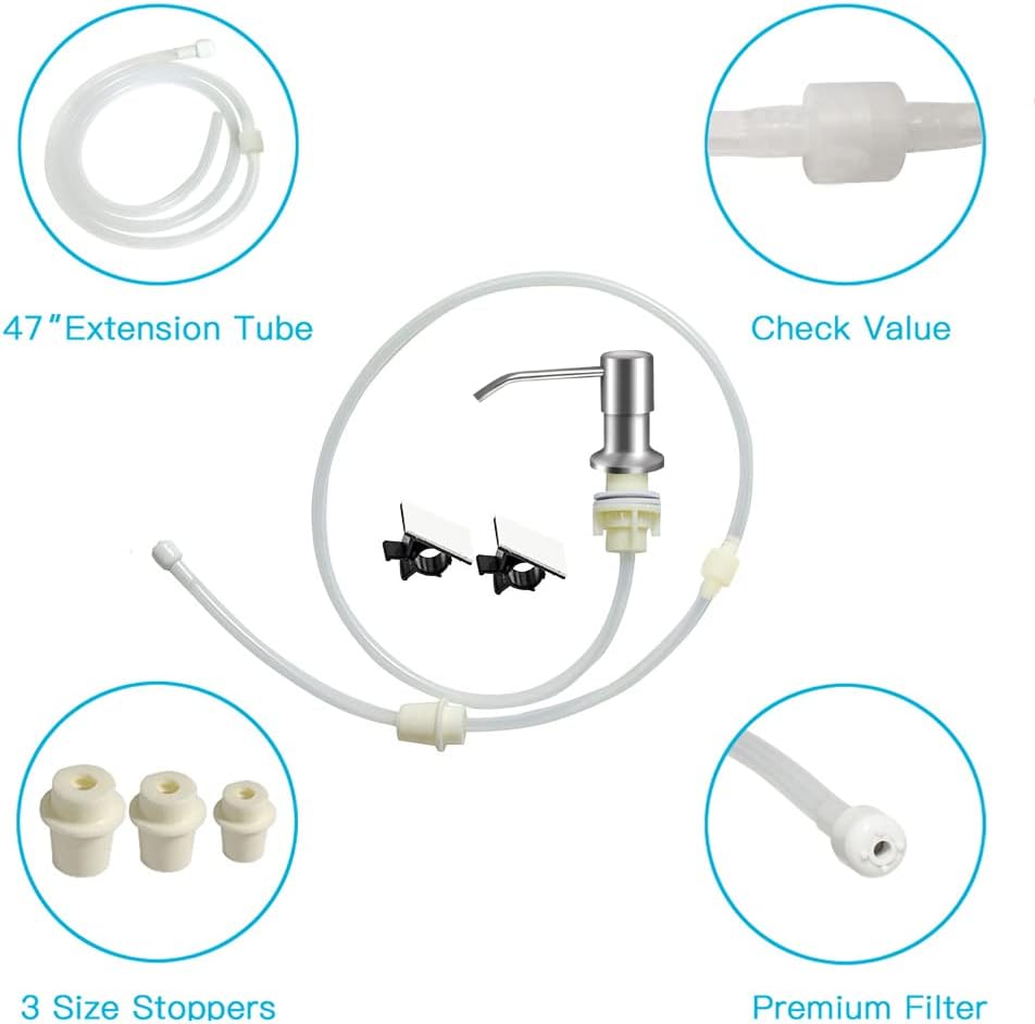 - 【Multipurpose Use】: The extension tube kit made with food-grade silicone tube 47'' is soft and flexible, check valve make it easier to pump out the soap, keep soap primed at the top of the tube, and the three stoppers make it fit all kinds of containers or bottles. It also can be used as follow: hand soap, liquid dish soap, shampoo, shower gel, or even hand-lotion or moisturizer ideal for kitchen, hotel or commercial uses.