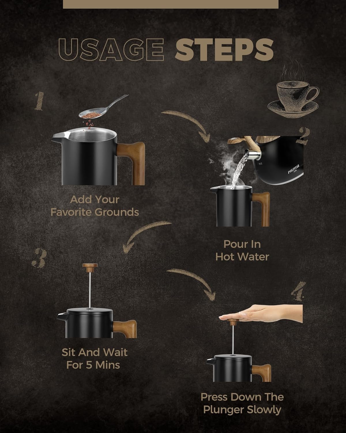 - LOOKING FOR COFFEE PRESS FOR MATCHING UP YOUR KITCHEN? We, the POLIVIAR french press coffee maker will be your smart choice. While the coffee pot is made from food grade stainless steel with stylish long-lasting coating, It is easily to match up your kitchenwares and your kitchen's theme. Also, the ergonomic handle with real wood will maximize the fantastic time of grounds you loved.