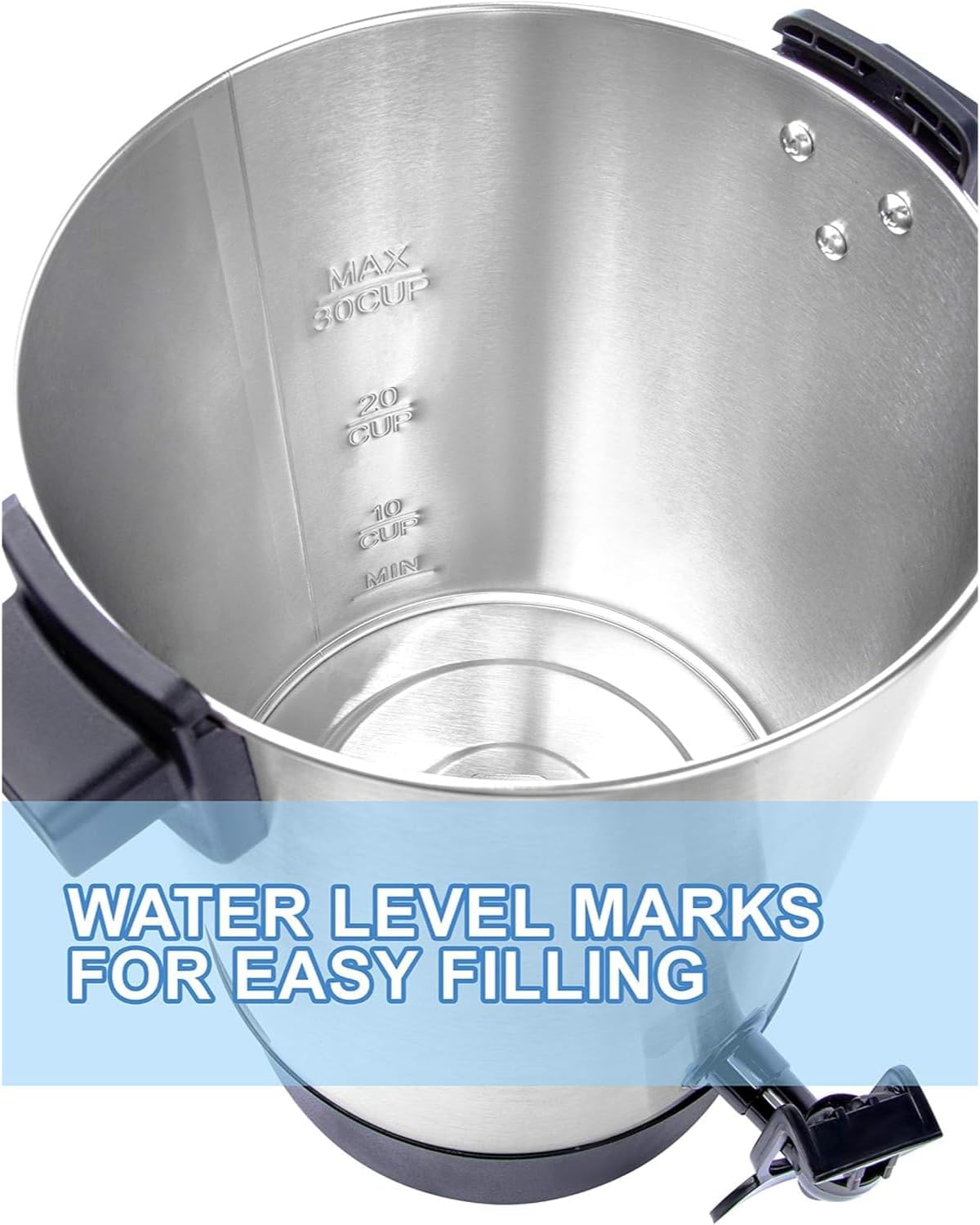 - βͺ COMMERCIAL USE--Brew 30 ~40cups (3.5 Liter / 1.2 Gallon) in 30 minutes. Built for catering service, ideal for large families, caterers, restaurants, churches, schools, health care facilities, offices and shops.