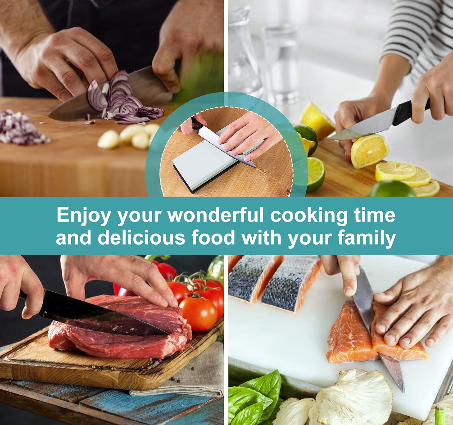 - SAFE AND EASY TO USE: Knife sharpener stone kit is super easy to assemble and comes with a silicone base that holds the stone within the non-slip acacia wood base so there is absolutely no slippage while you work