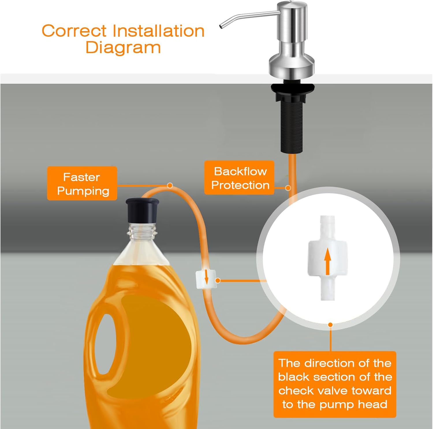 - What You Get: One soap dispenser pump head, 2 tubes, one subuliform bottle stoppers to fit all soap containers, a check valve connects two-tube, anti-leak accessories and 3 fastening bolts.