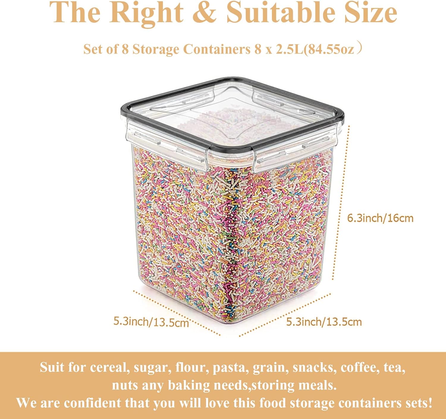 - MUITI-PURPOSE: Includes 8 (2.5L/85oz--Length/width/height: 5.3inch/5.3inch/6.3inch) Airtight Containers Cereal Containers; Store your favorite foods safely into these efficient containers; Perfect for baking supplies, cereal, rice, sugar, flour, pasta, grain, snacks, coffee, tea, nuts; Freezer & dishwasher safe