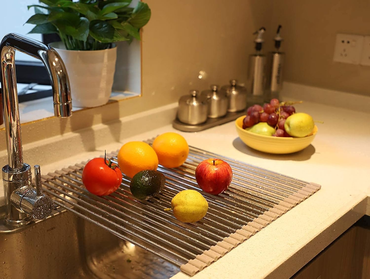 - Multi-use Folding Dish Drying Rack: This roll up drying rack unrolls above an open sink for air-drying washed dishes, for additional counter top space, or as a trivet. Vegetable and fruit dish drainers, great kitchen dish racks for counter