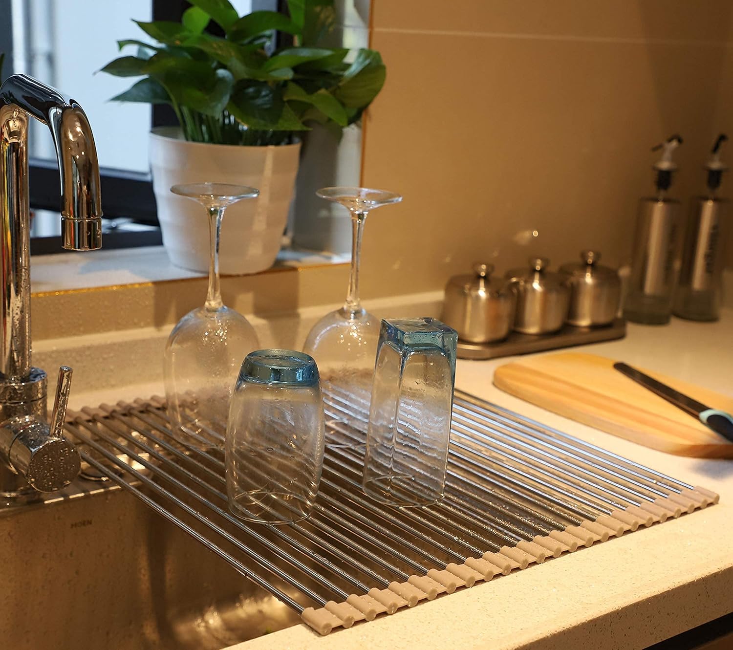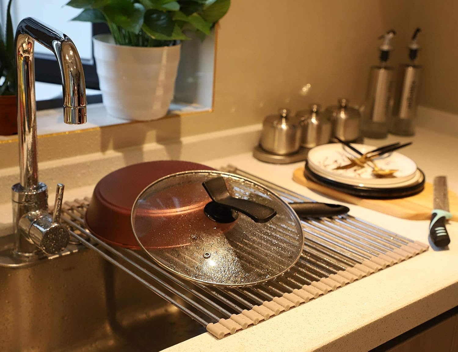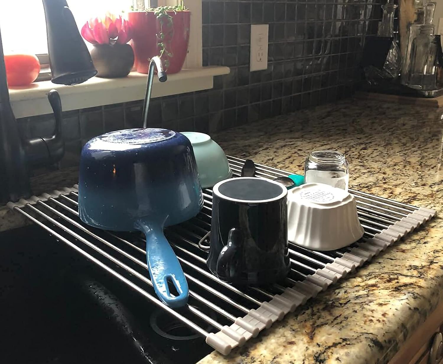 - Roll up Sink Drying Rack and Spacing-saving Dish Drying Mat: This dish drainer can roll up and go in a drawer quickly when not in use. Works great and keeps the kitchen sink area looking neat, the best one of dish drainers for kitchen counter. You can roll up this over the sink dish drying rack as much as you like during using it and for the pipes also can be removable