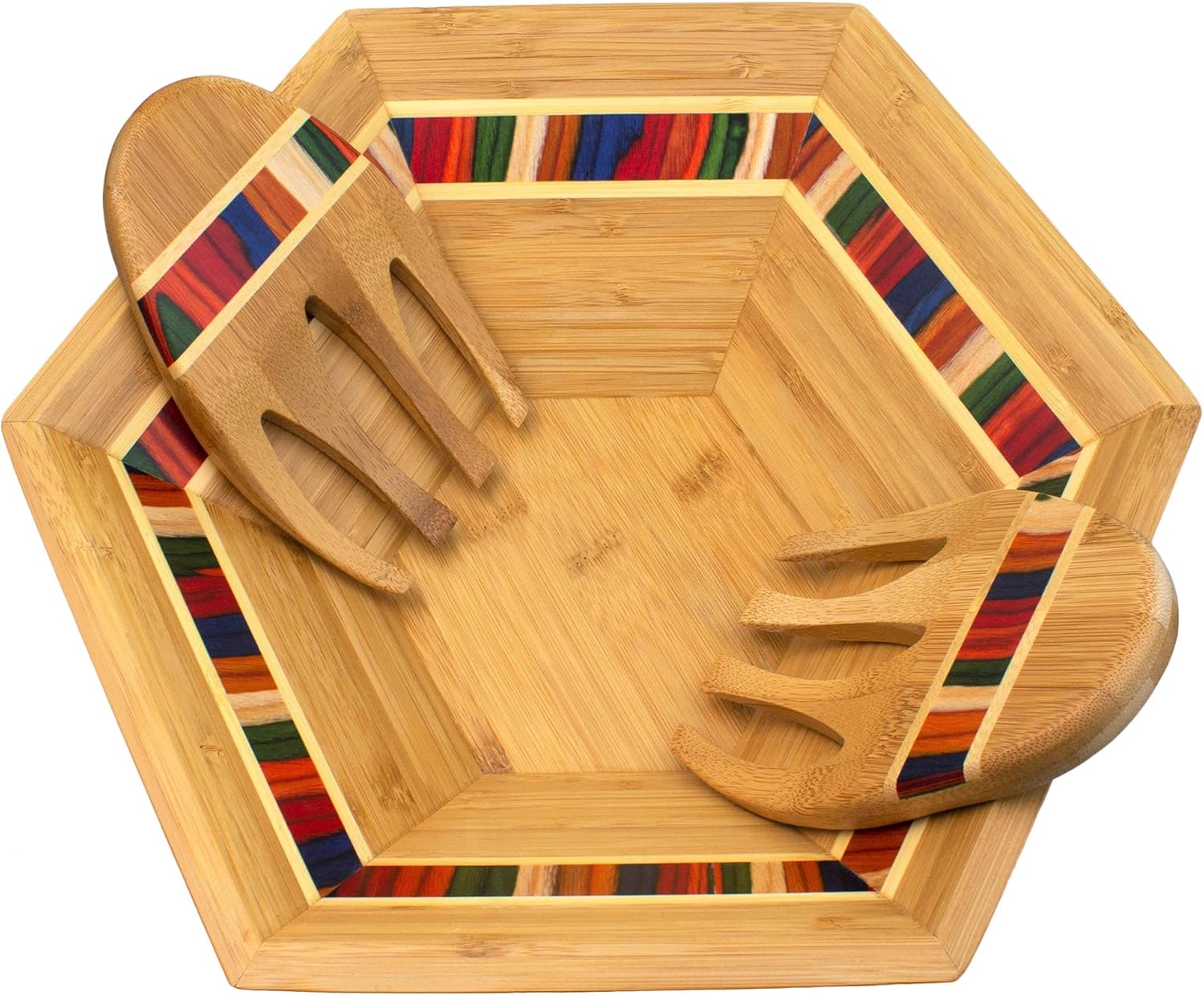 - A bright and beautiful way to serve salads: bowl and salad hands utensil set both feature a gorgeous inlay of colored birch wood within bamboo