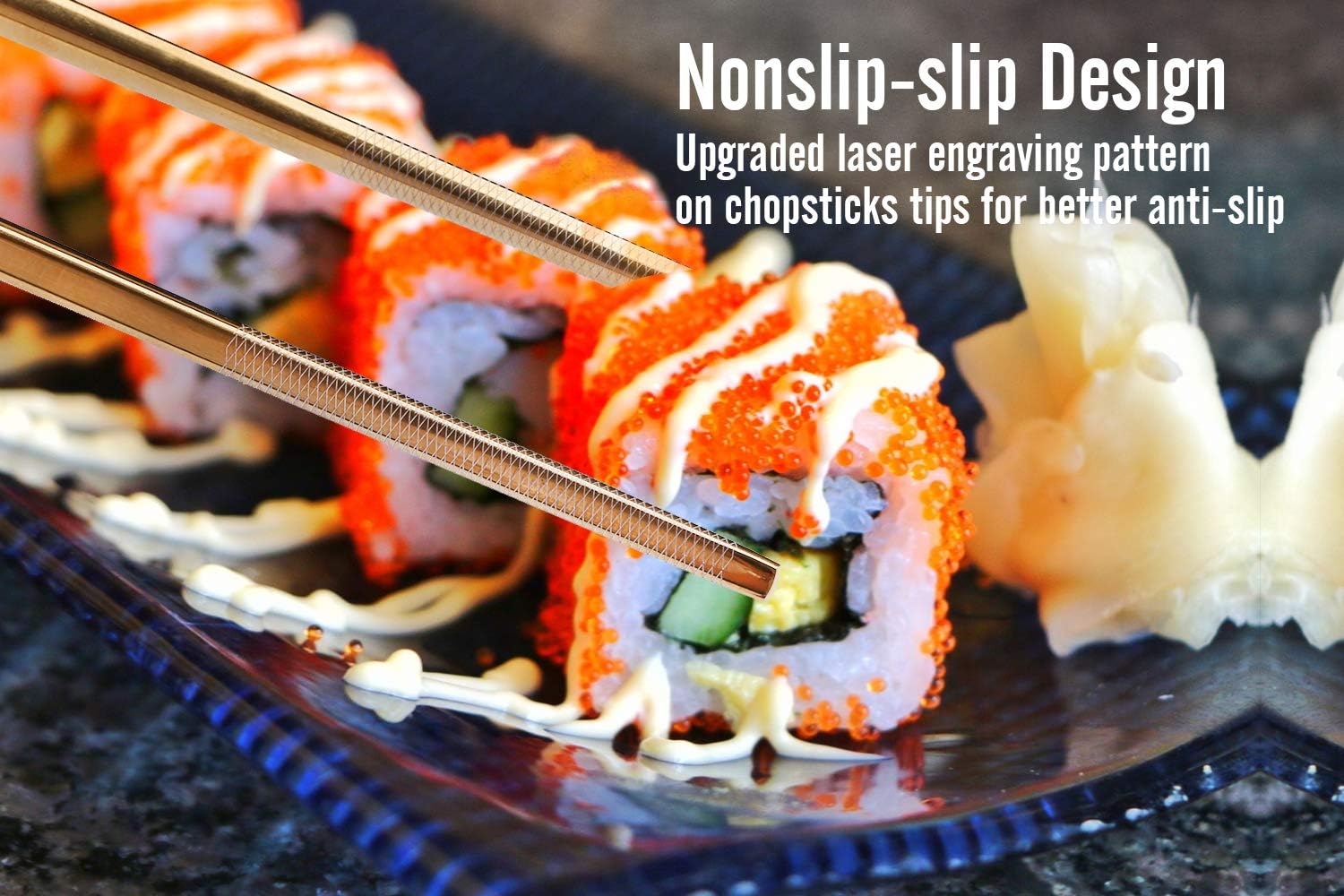 - ✿ 【Upgraded Non-slip Design】: Our metal chopsticks add fashion line laser engraving on the chopsticks tip. Comparing with the round spot etching chopstick and the smooth chopstick, the chopsticks with line engraving on chopsticks tip can better grab and keep the food. It makes the stainless steel chopsticks easy to use and avoids the embarrassments of dropping the food. The reusable chopsticks with square design are easier to hold than round chopsticks and no rolling when putting on surface.