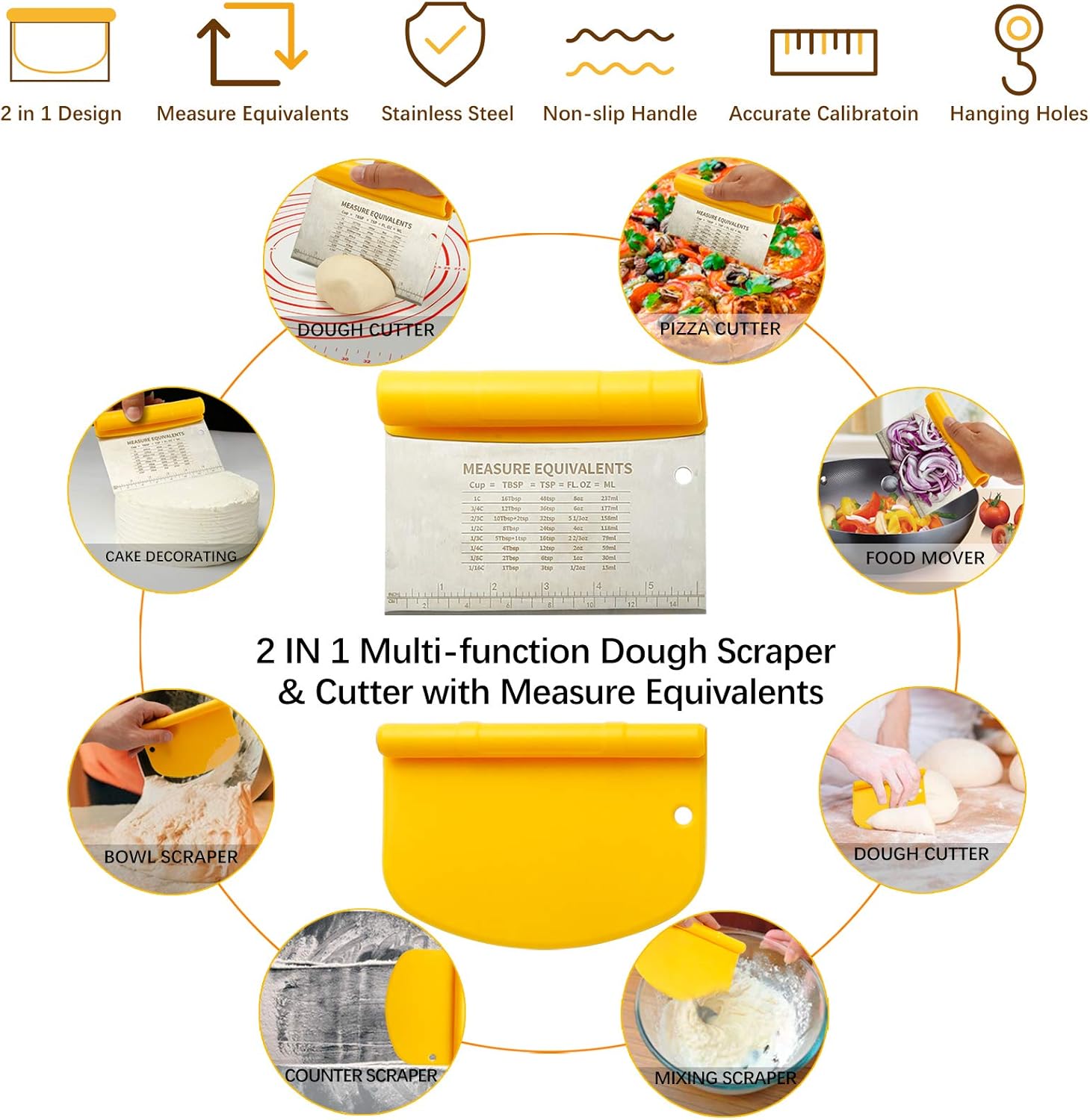 - 2 IN 1 Dough Scraper & Pizza Cutter Set: The baking tool set is multifunction, such as dough scraper, cake server, pizza cutter, food remover, dough cutter / chopper, etc. Clean kitchen counters of crumbs and dried dough. Smooth out frosting/cream on cakes, divvy up butter and much more, and Use cake scrapers to create your own unique cake shape ! All of them has a hole so you can hang them within easy reach.