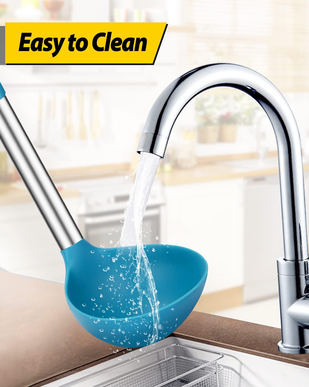 - More Safe and Healthy : Our kitchen ladle spoons are made of food-grade silicone, free of BPA;Even at high temperatures, there is no need to worry about melting or deforming;And the soft silicone head won't scratch the coating, it can better protect your pot