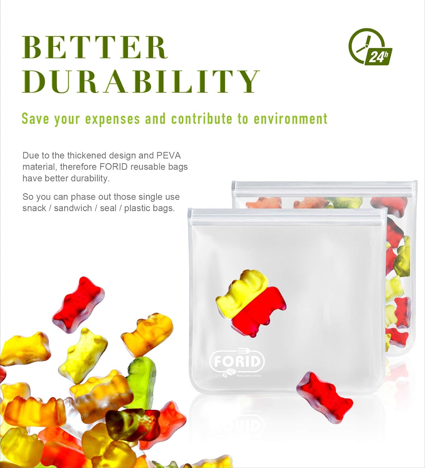 - Food Grad Material & Eco-Friendly - FORID 1 gallon storage bags feature upgrade FDA food-grade PEVA material, which is eco-friendly, silicone & plastic-free, PVC-free, chloride-free, BPA-FREE, harmless to the environment when disposed of or burned. Choose these healthy and safe reusable gallon bags for your family and the earth!