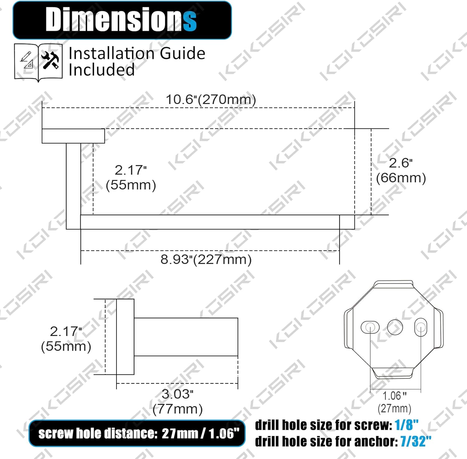 - ◄ Dimension ► Overall length: 27.1CM/ 10.67 inches; Length of hanging space: 23CM/ 9 inches; Depth/Width(from the rail to the wall): 5.6 - 6.6CM / 2.2 - 2.6 inches. If you have any queries for the size or any problem for the product, please message seller first.