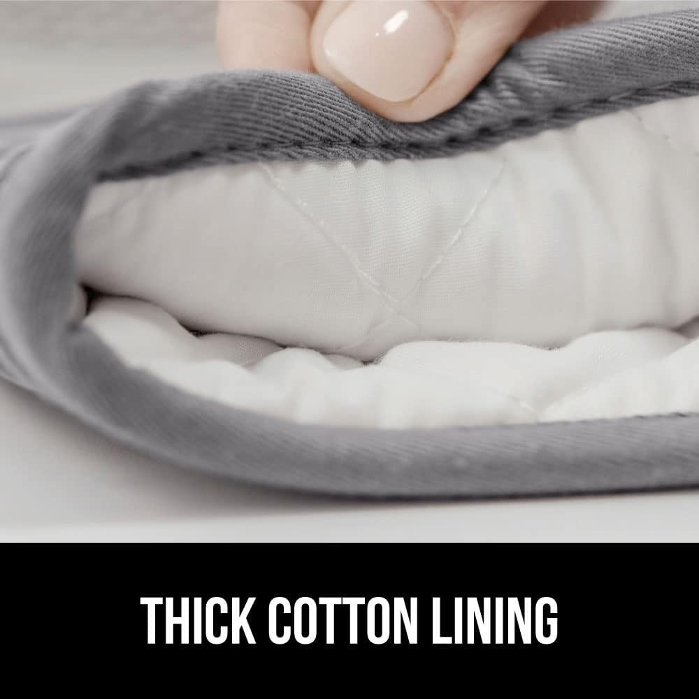 - THICK COTTON LINING THROUGHOUT: stay comfortable while you cook; soft cotton lining offers additional protection and comfort, and feel simply amazing; plus, silicone is flexible and conforms easily to your unique grip