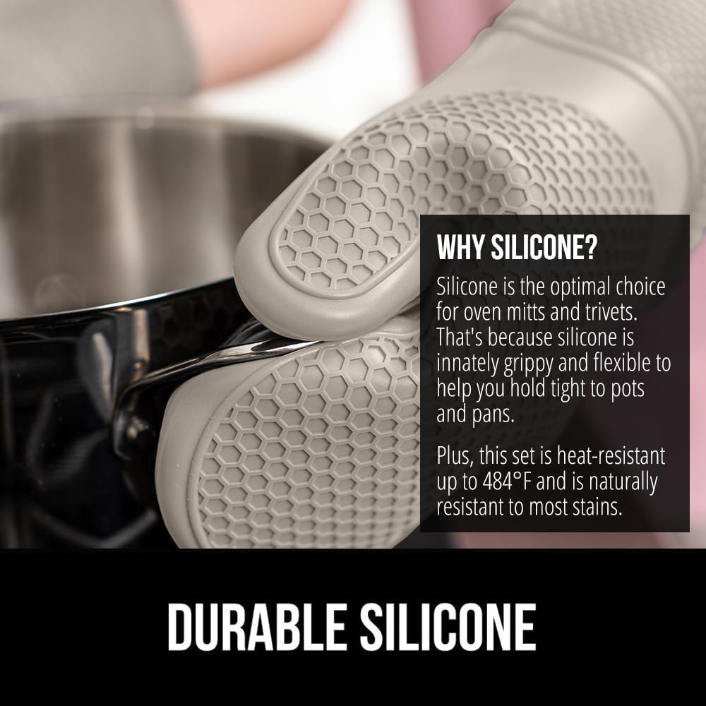 - WATERPROOF AND STAIN RESISTANT: no more constantly stained oven mitts and trivets; Gorilla Grip Silicone Mitts and Trivets are both stain resistant and waterproof; spills can easily and instantly be rinsed away under water; hot liquids wonโt soak through and scald your skin as they would with other materials; trivets are also dishwasher safe