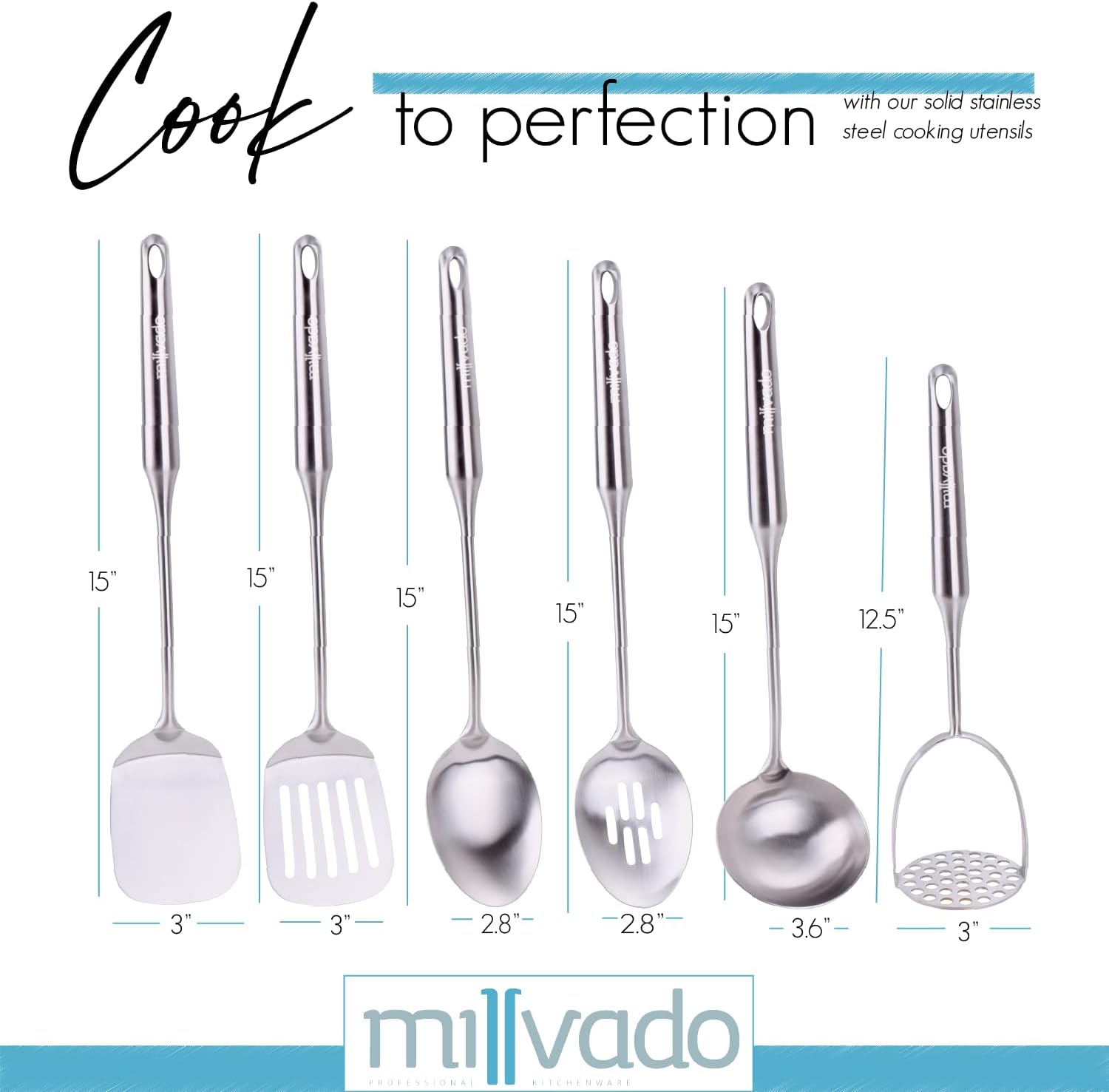 - STAINLESS STEEL: These sturdy cooking utensils will not crack, bend, chip or warp, even from high heat. Strong and tough, they will not flex from the thickest of stews or the heaviest of foods. Plus, they are stain and rust resistant and will not absorb odors or flavors, so you can safely use them to cook and serve even acidic foods.