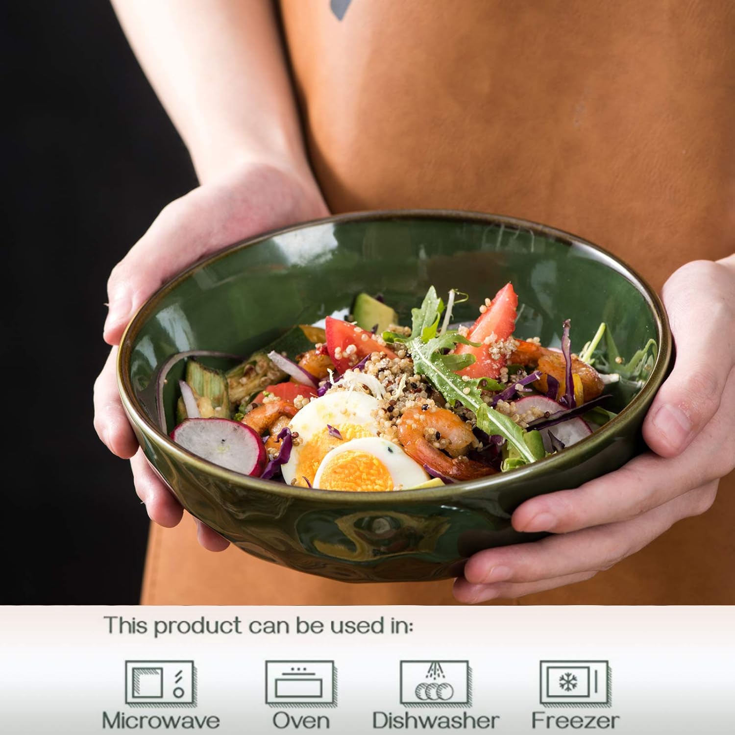 vicrays Ceramic Pasta Bowls Set, 32 Ounce Soup Bowls, Large Salad Bowls, Chip Resistant, Dishwasher Microwave Safe, Fluted stoneware Bowls for Kitchen, Serving Bowls, Set of 6 (Green)