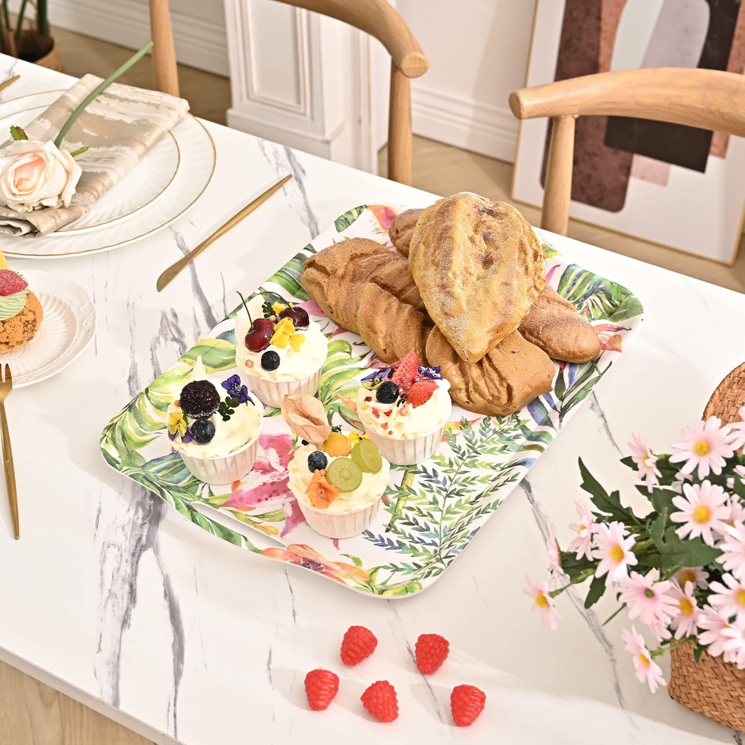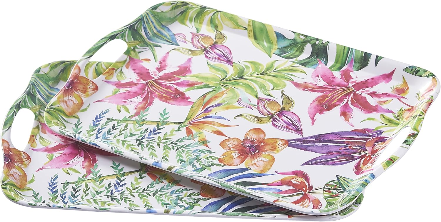 Blue Boat 16.5" x 11.5" Rectangular Serving Trays Set of 2 Floral, Light Weight Easy to Clean Sturdy Stackable Melamine Serving Tray with Handle, Fruit, Snacks, and Desserts Trays