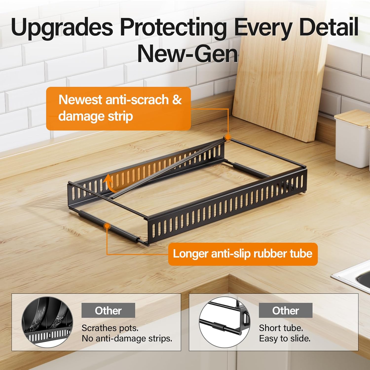 - SCRATCH-FREE & PROTECTIVE β Featuring an upgraded anti-scratch strip, this pot lid organizer for cabinet protects your cookware from damage. The longer support tubes effectively prevent sliding, keeping your pots and pans in pristine condition