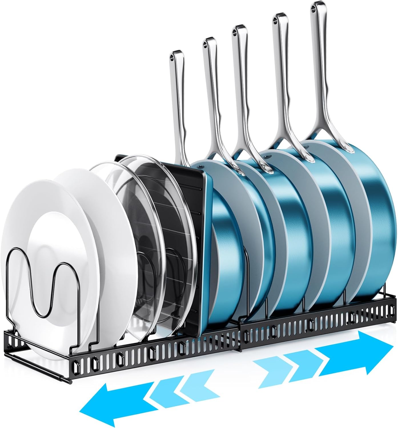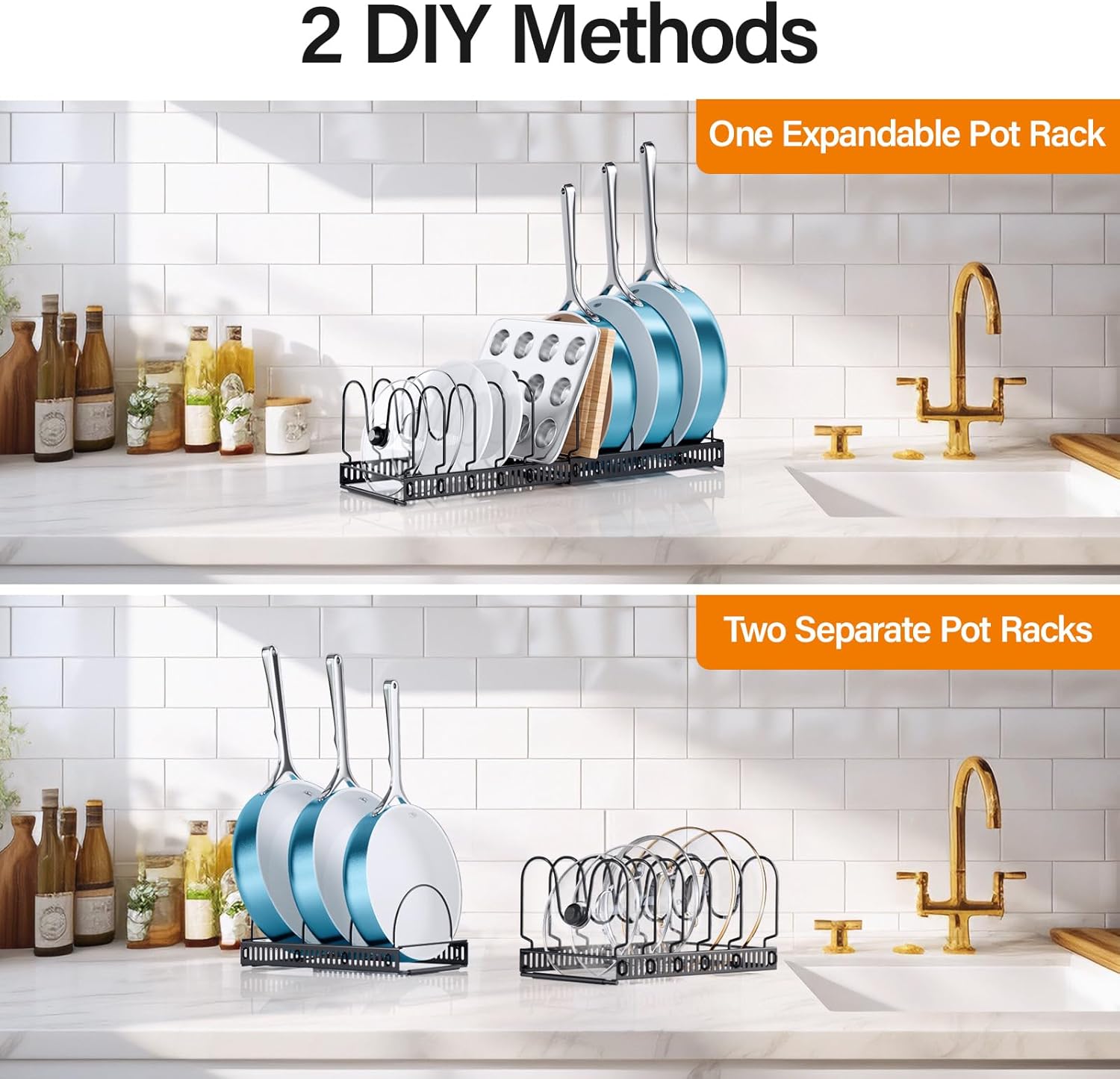- ADJUSTABLE & FLEXIBLE STORAGE β The ORDORA expandable pot and pan organizer rack offers 2 storage options: two separate pan lid organizers inside cabinet or one large pot rack organizer adjustable from 12 to 23 inches. Fits cabinets, pantry shelves, deep drawers, and countertops, transforming your kitchen into an organized, space-saving area