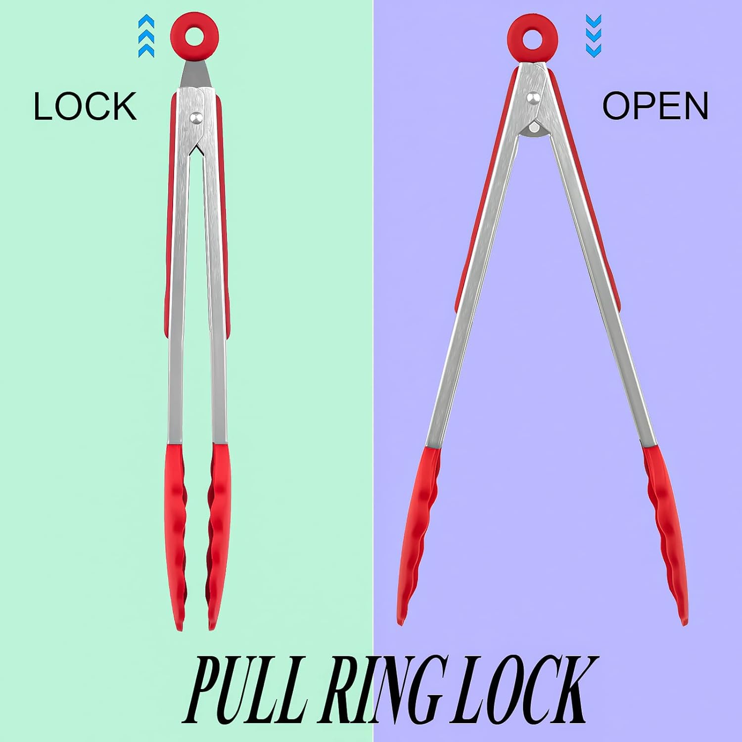 - EQUIPPED WITH A PULL-RING TECHNOLOGY: Our kitchen tongs are designed with a locking mechanism. The pull ring technology will keep your tongs from opening and closing. Simply pull the ring to lock and push to unlock.