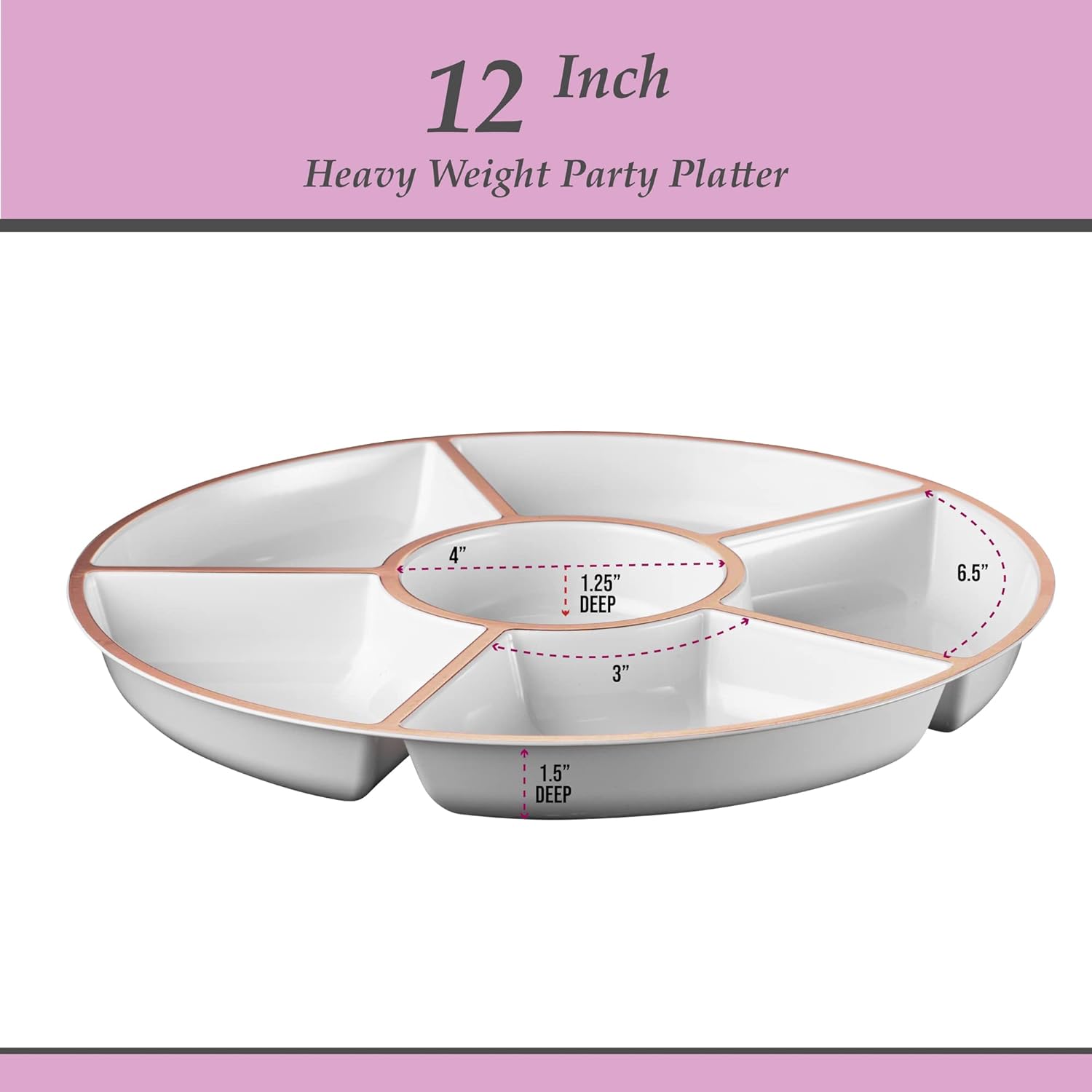 Plasticpro 6 Sectional Round Plastic Serving Tray/Platter (8, White & Rose Gold)