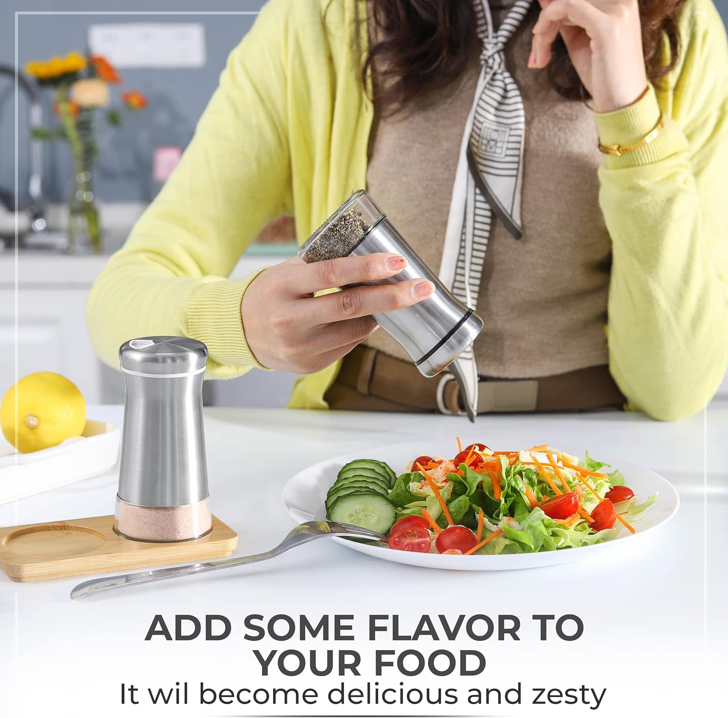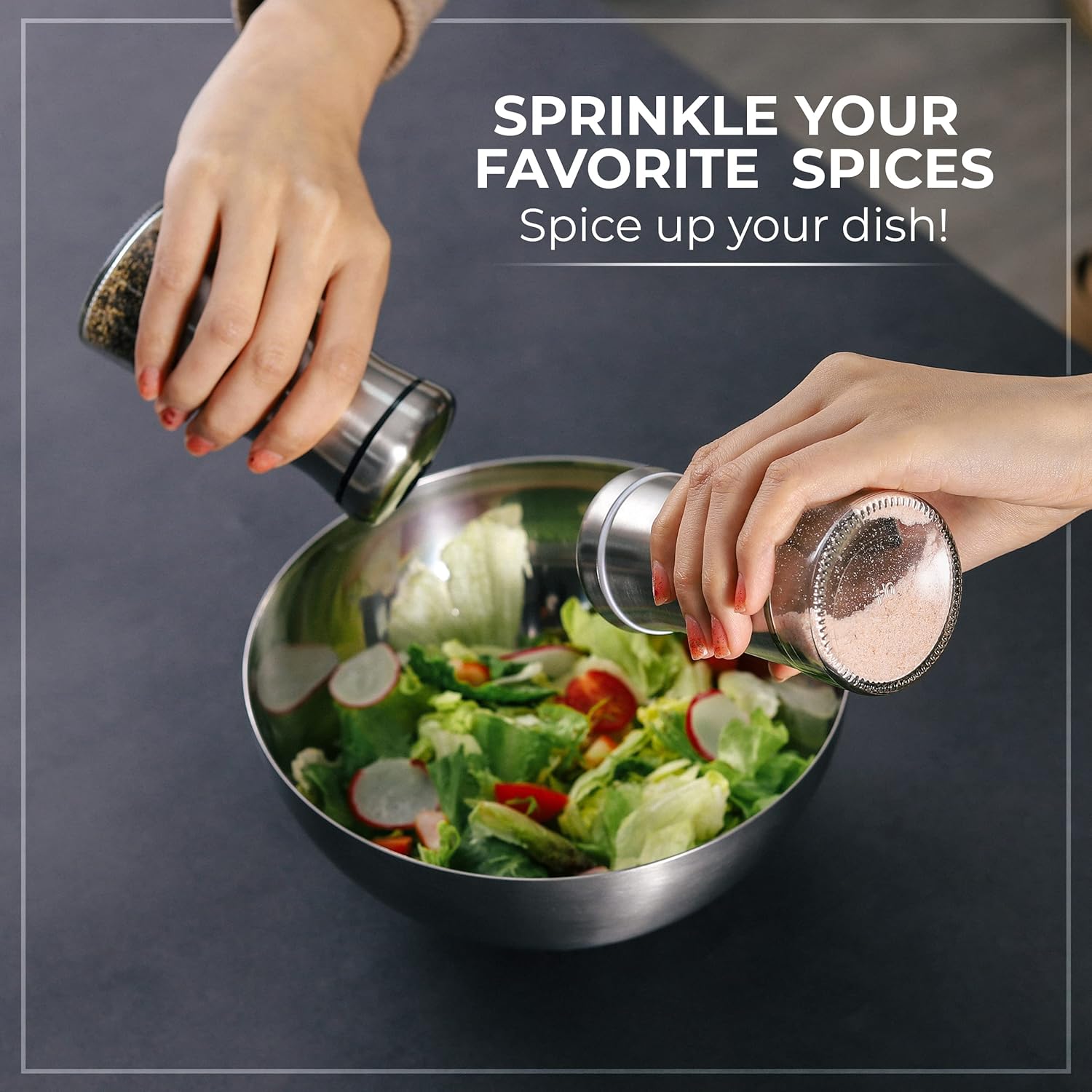 - ✅ Choose your spice – Fill the shaker with your favorite spices like Sea, Himalayan, Table, or Kosher Salt. Black, White, or Four-color Pepper, or any other seasoning you can imagine. Adding your favorite spices will enrich your food perfect flavors on each meal. * Spices are not included.