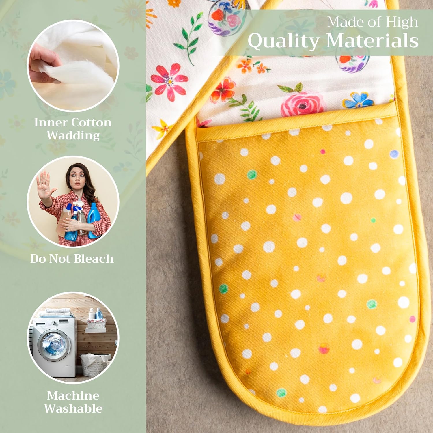 - 100% Quilted cotton: Crafted from premium quilted cotton for superior heat resistance and durability. This double oven mitt offers a soft, flexible grip and protects your hands during baking, roasting, or grilling