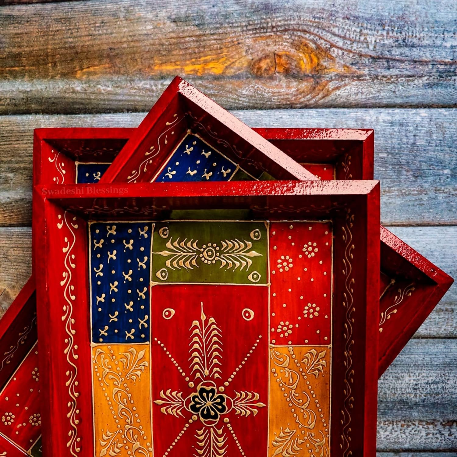 Swadeshi Blessings Handcrafted & Hand-Painted Embossed Wooden Serving Trays Set of 3- for Kitchen/Table & Home Decor/Dinning/Gifts/Restaurants/Living Room/Coffee Table (AntiqueRed)