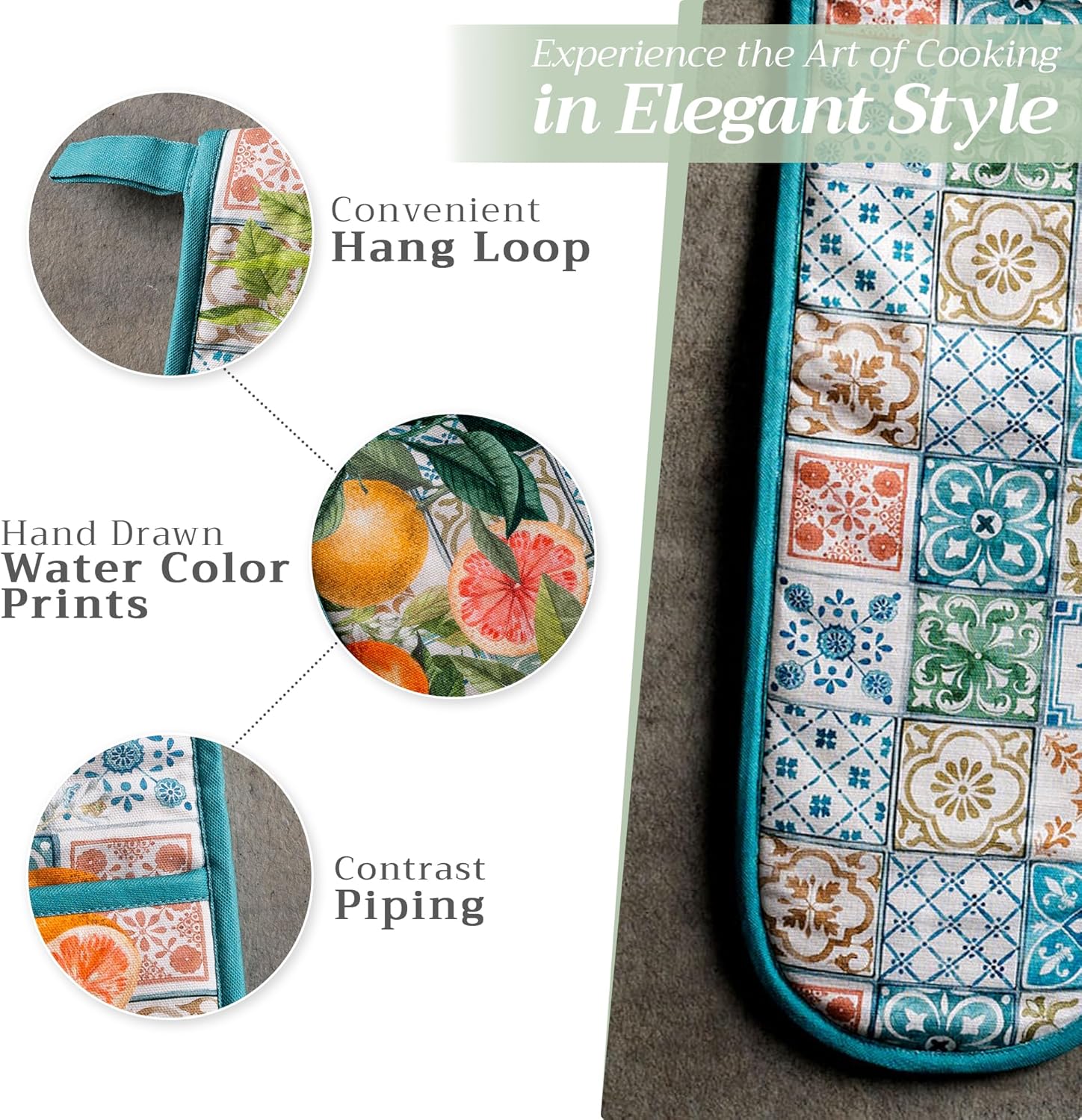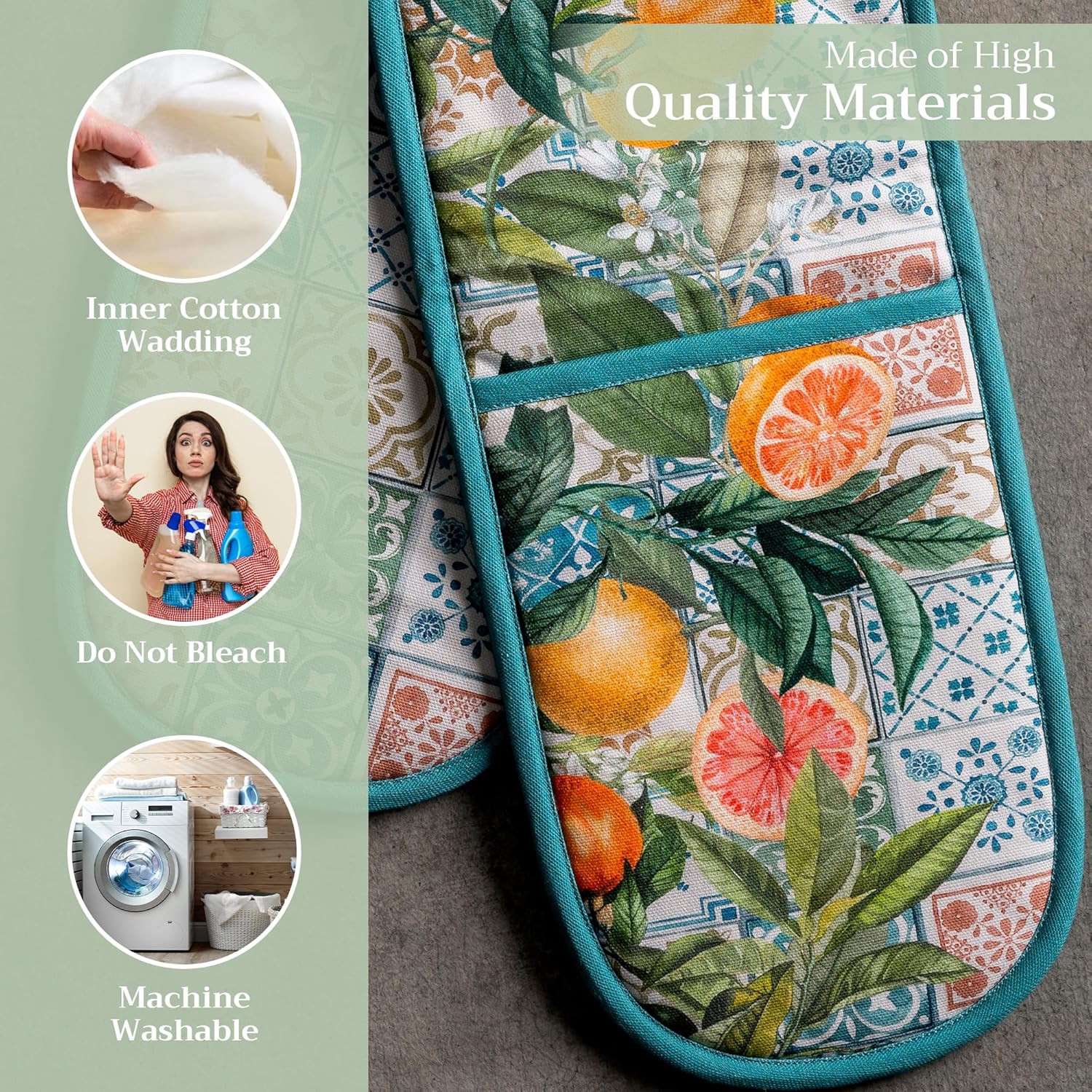 Maison d' Hermine Double Oven Mitts 100% Cotton 7"x35" Double Oven Mitt Heat Resistant BBQ Cooking Gloves with Loop, Baking, Grilling, Home, Kitchen, Handling Hot Pans Spring Summer (Agrume)