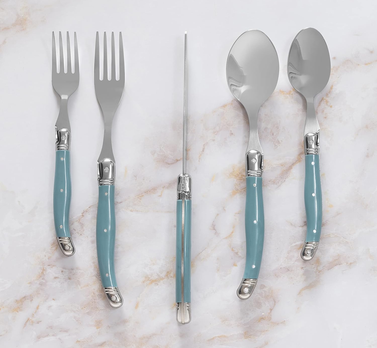 - Stylish and Functional: With its chic aegean teal handles, the Laguiole flatware set for 4 adds sophistication to any table; practical and refined, this dishwasher safe Laguiole knife, fork and spoon set is comfortable to hold and easy to use