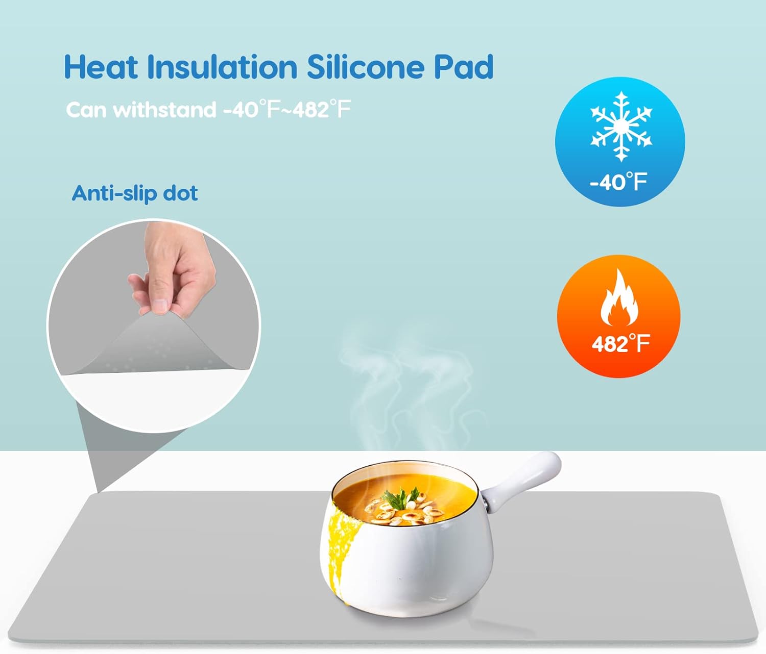 - 【A MUST-HAVE MAT】: Our extra large silicone counter mat are widely used for home, kitchen, office, classroom, outdoor, baby, pet and any occasion. Can be used as countertop mat, table mat, pastry mat, placement mat, heat resistant mat, craft mat, pet feeding mat or a baby pad etc. Table protector, mat for crafts, jewelry, casting moulds and other DIY tools and materials. It’s cuttable to fit different sizes and shapes.