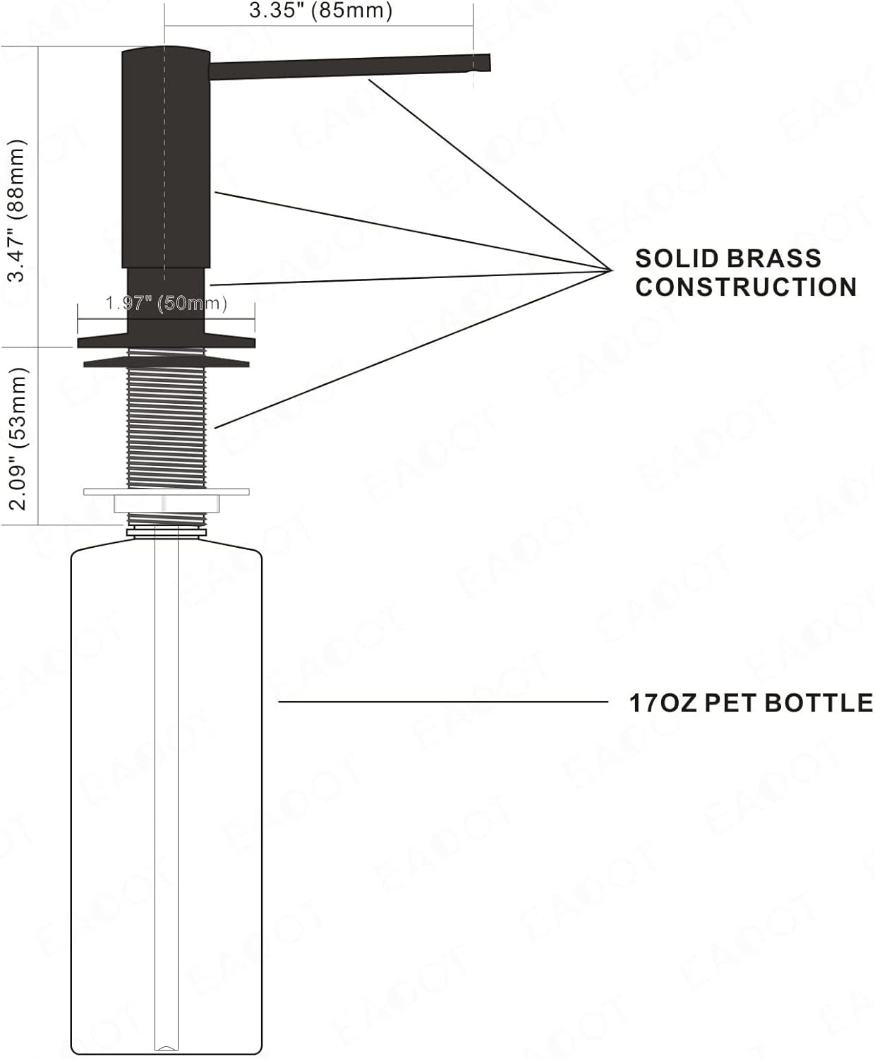 - ๏ธBuilt To Last:Sturdy built in sink soap dispenser for kitchen sink, solid brass pump head and threaded tube with 17 OZ PET plastic bottle, corrosion resistant spring. SOLID BRASS CONSTRUCTION brushed nickel rust resistant finish that will not tarnish as time goes on. The soap dispenser pump mechanism is designed for long lasting excellent performance to dispense consistently with each and every press. Coordinates with most faucet models from different brands.