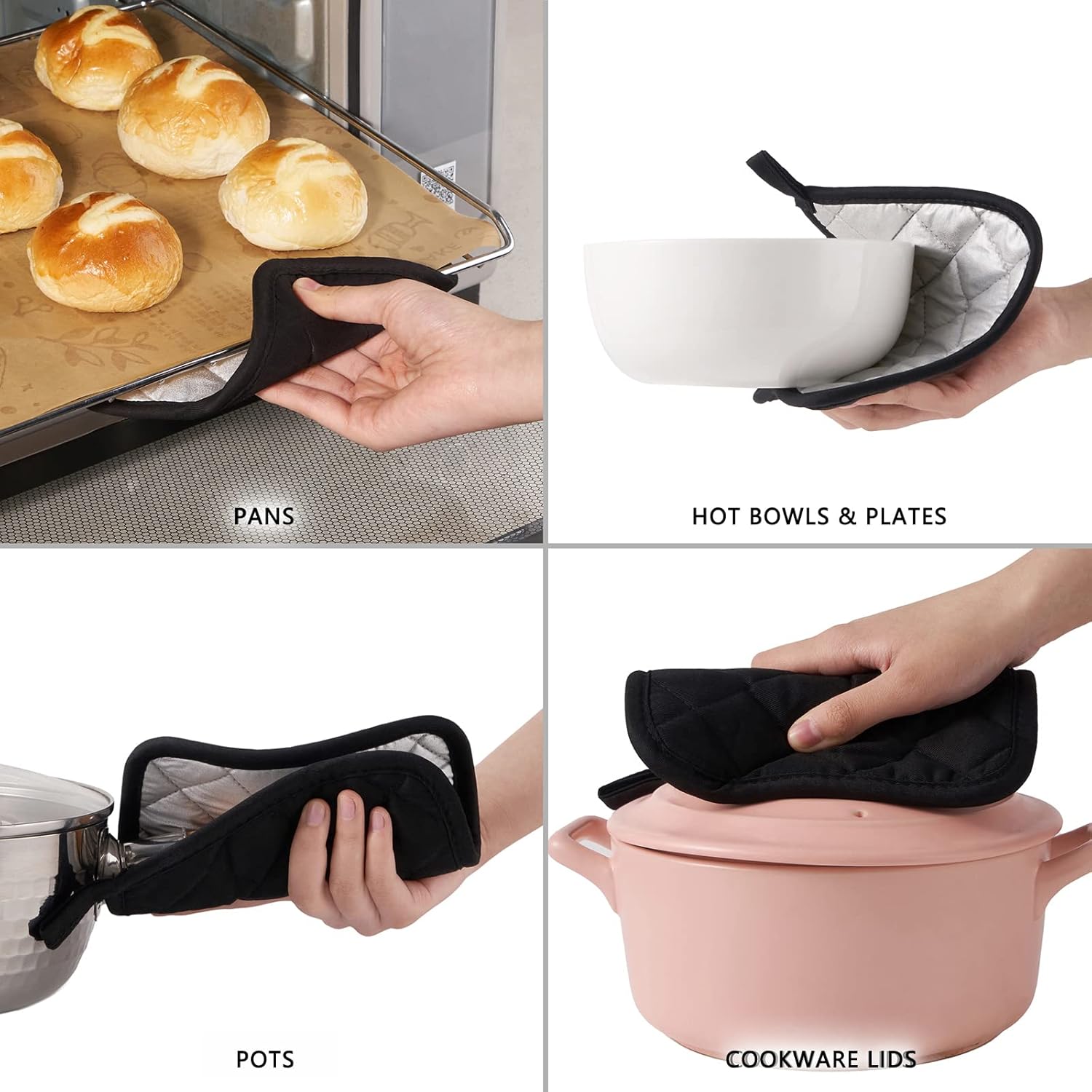 - QUILTED AND PADDED - The construction of these potholders/hot pads helps to protect your hands and arms from the heat of the oven. Quilting allows for easy flexibility in this potholder, offer durability and grip. The heat resistant material allows you to safely remove hot dishes pans, and pots from the oven.