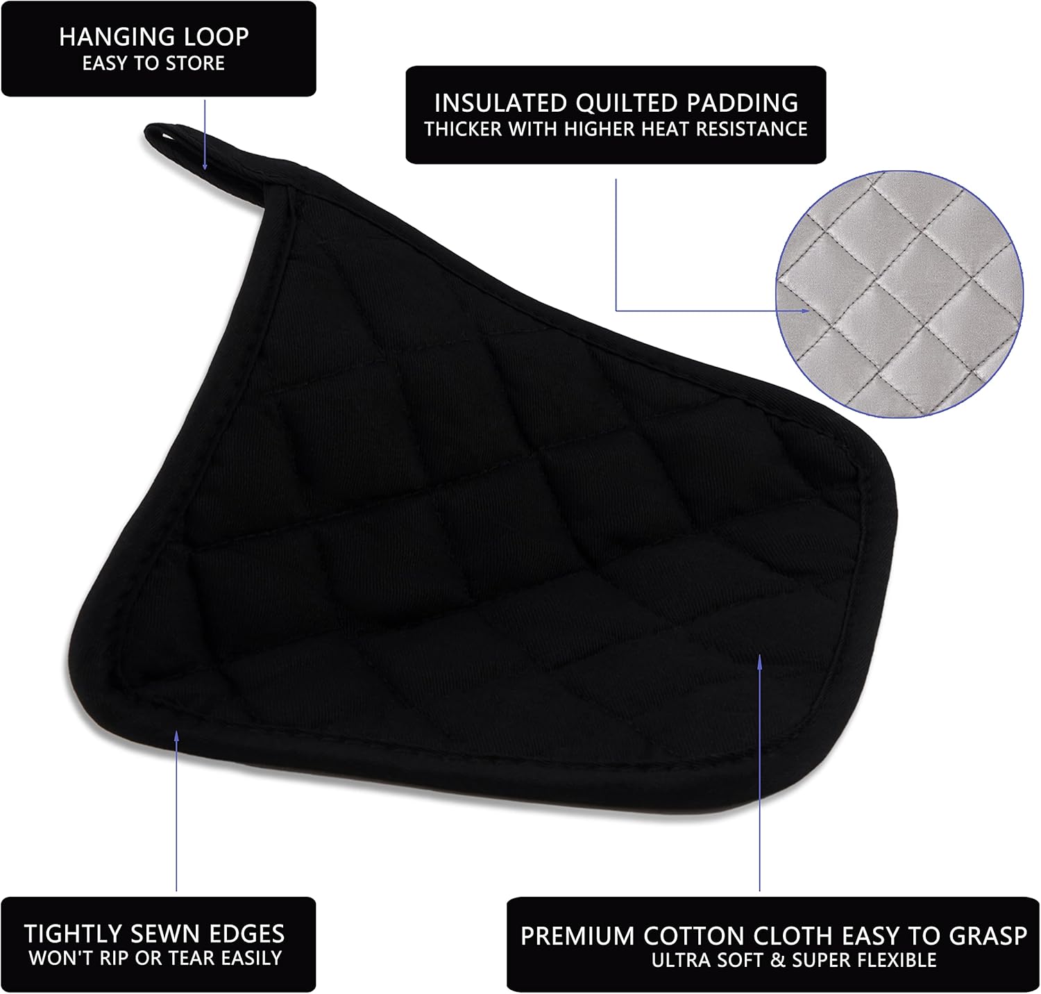- QUALITY PRODUCT: 100% terry looped cotton on one side and a heat resistant silverstone lining on the other with pure cotton filled. Hanging loop allows for easy storage, easy to clean, durable.