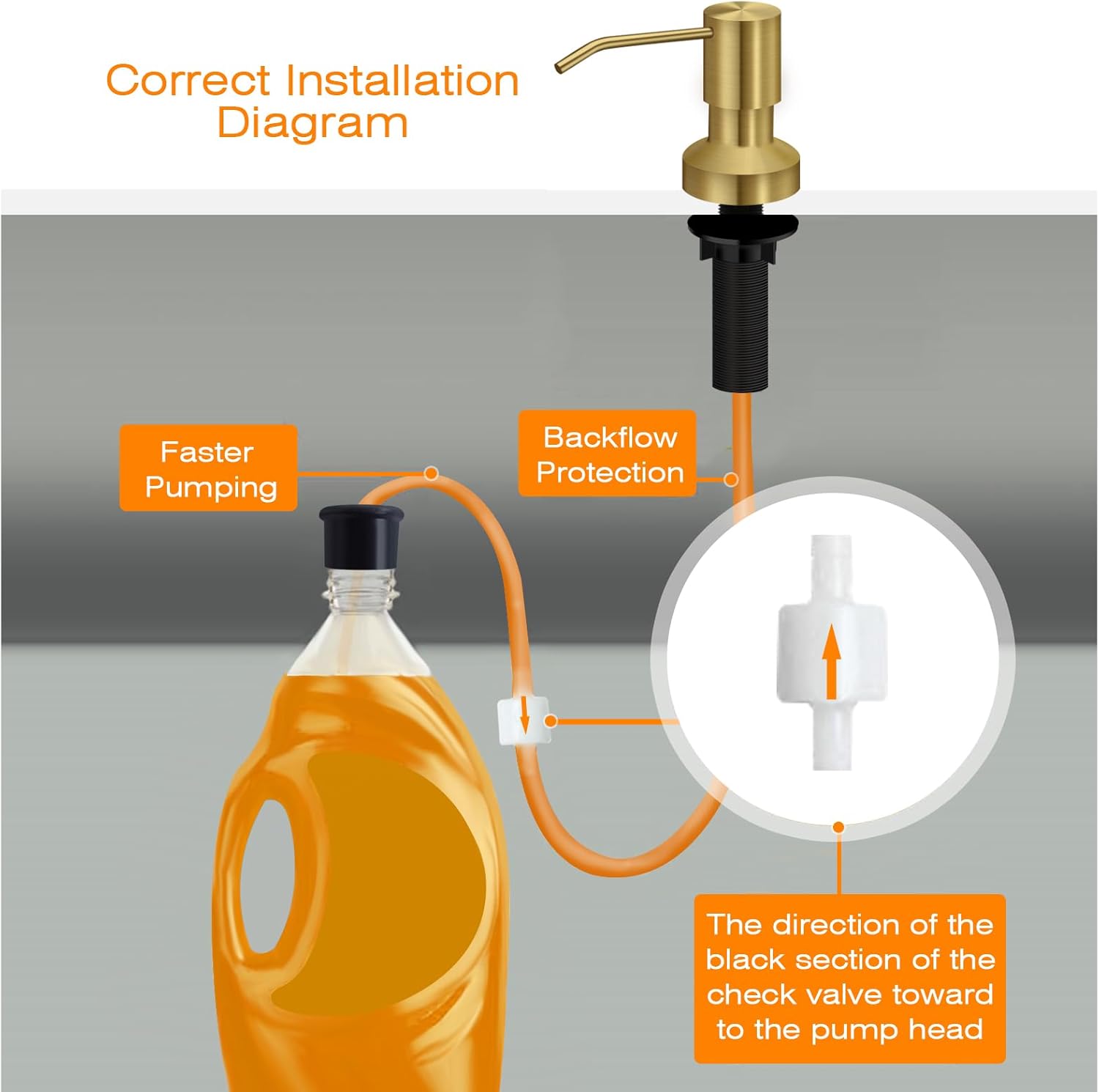 - What You Get: One soap dispenser pump head, 2 tubes, one bottle stopper to fit all soap containers, a check valve connects two-tube, anti-leak accessories and 3 fastening bolts.