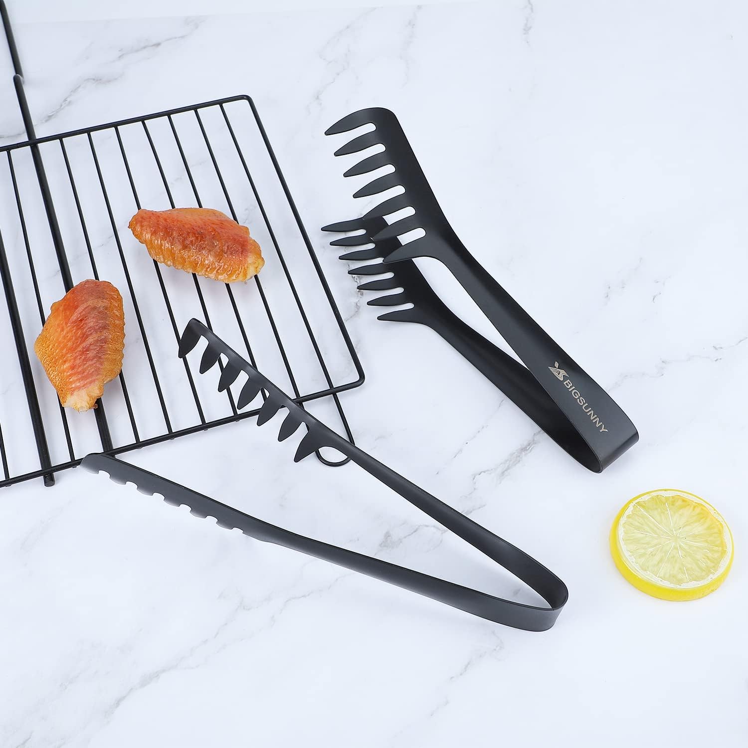 MSY BIGSUNNY 8-Inch Pasta Tongs, Stainless Steel Food Serving Tongs, Rust-Proof Spaghetti Tongs (Set of 2, Black)