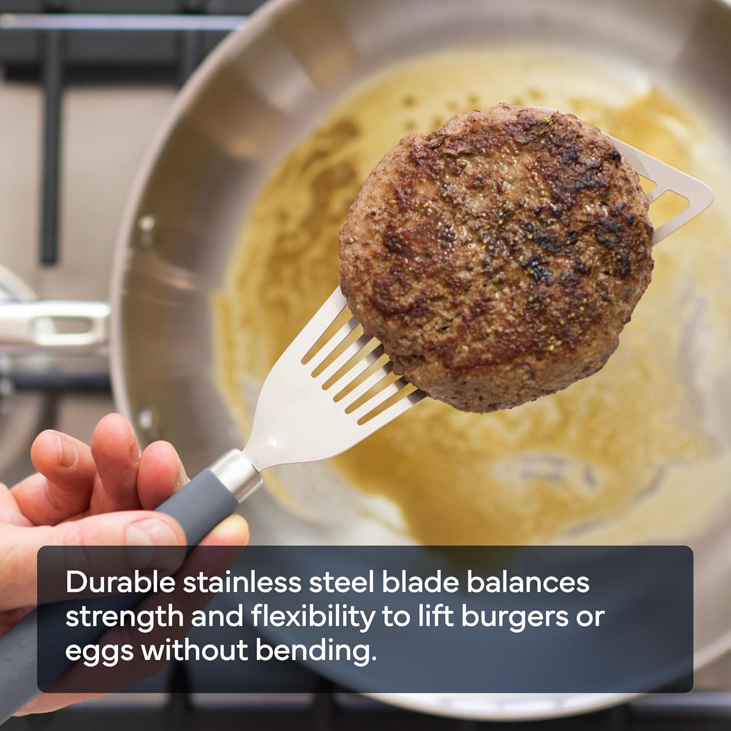 - PRECISION IN EVERY FLIP: This wide-slotted turner is perfect for cooking a variety of meals. Whether it's delicate eggs, sizzling fish, meaty burgers, or fluffy pancakes it allows you to fry and flip with ease, ensuring your creations are cooked just the way you desire.